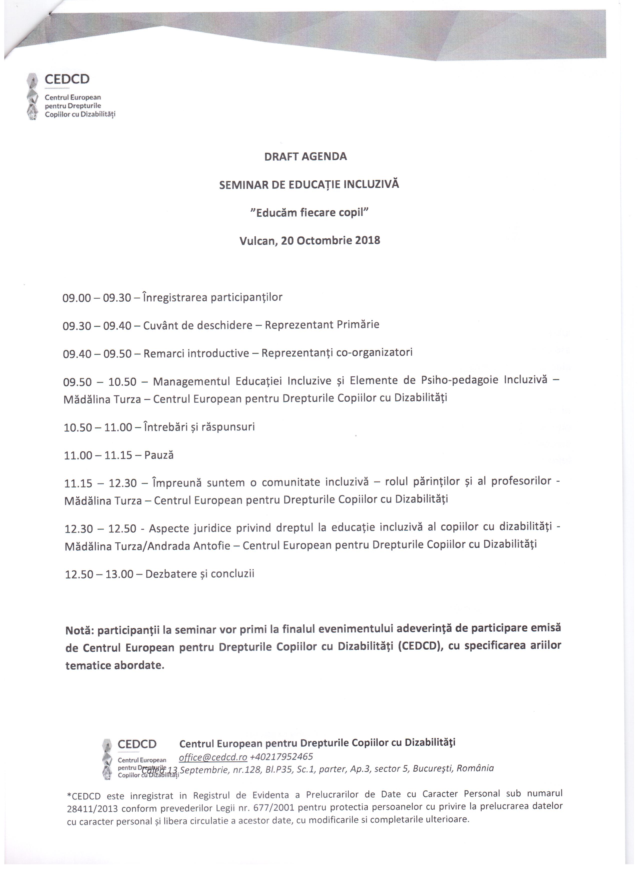 Centrul European pentru Drepturile Copilului cu Dizabilități CEDCD care, în parteneriat cu Primăria Vulcan și Asociația Down Valea Jiului organizează sâmbătă 20 octombrie 2018, începând cu ora 9.00, Seminarul de educație incluzivă „Educăm fiecare copil. Împreună suntem o comunitate.
