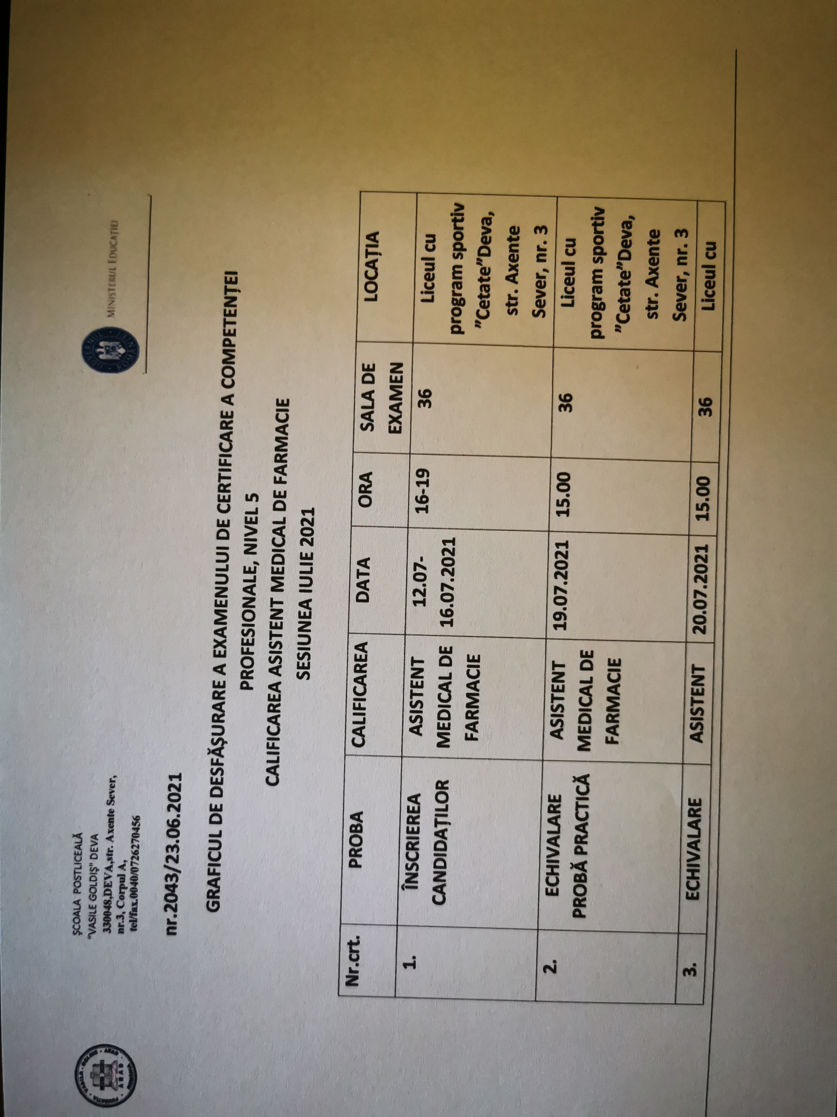 ȘCOALA POSTLICEALĂ VASILE GOLDIȘ DEVA, GRAFIC EXAMEN NIVEL 5, CALIFICAREA AMF,
