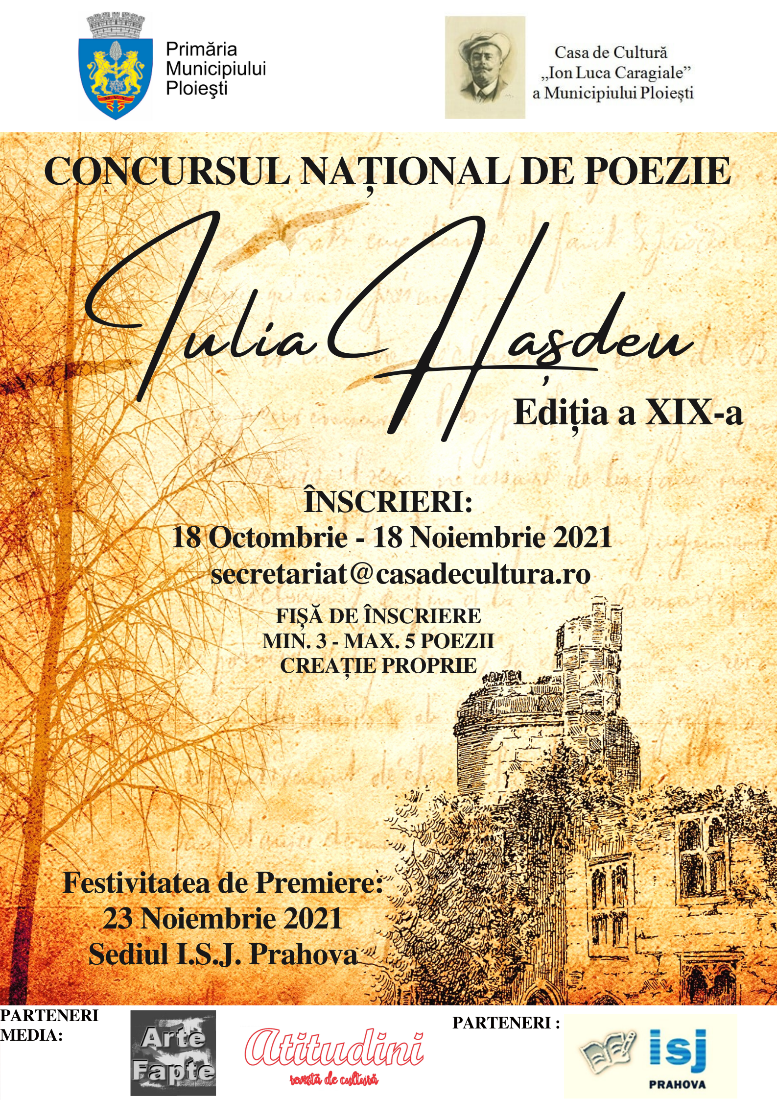 Ne face o deosebită plăcere să vă facem cunoscut că, în perioada 18 octombrie – 23 noiembrie 2021, Casa de Cultură „Ion Luca Caragiale” a Municipiului Ploiești organizează cea de-a XIX-a ediţie a Concursului Naţional de Poezie „Iulia Haşdeu” – proiect cultural dedicat liceenilor (cursuri de zi) din România.
