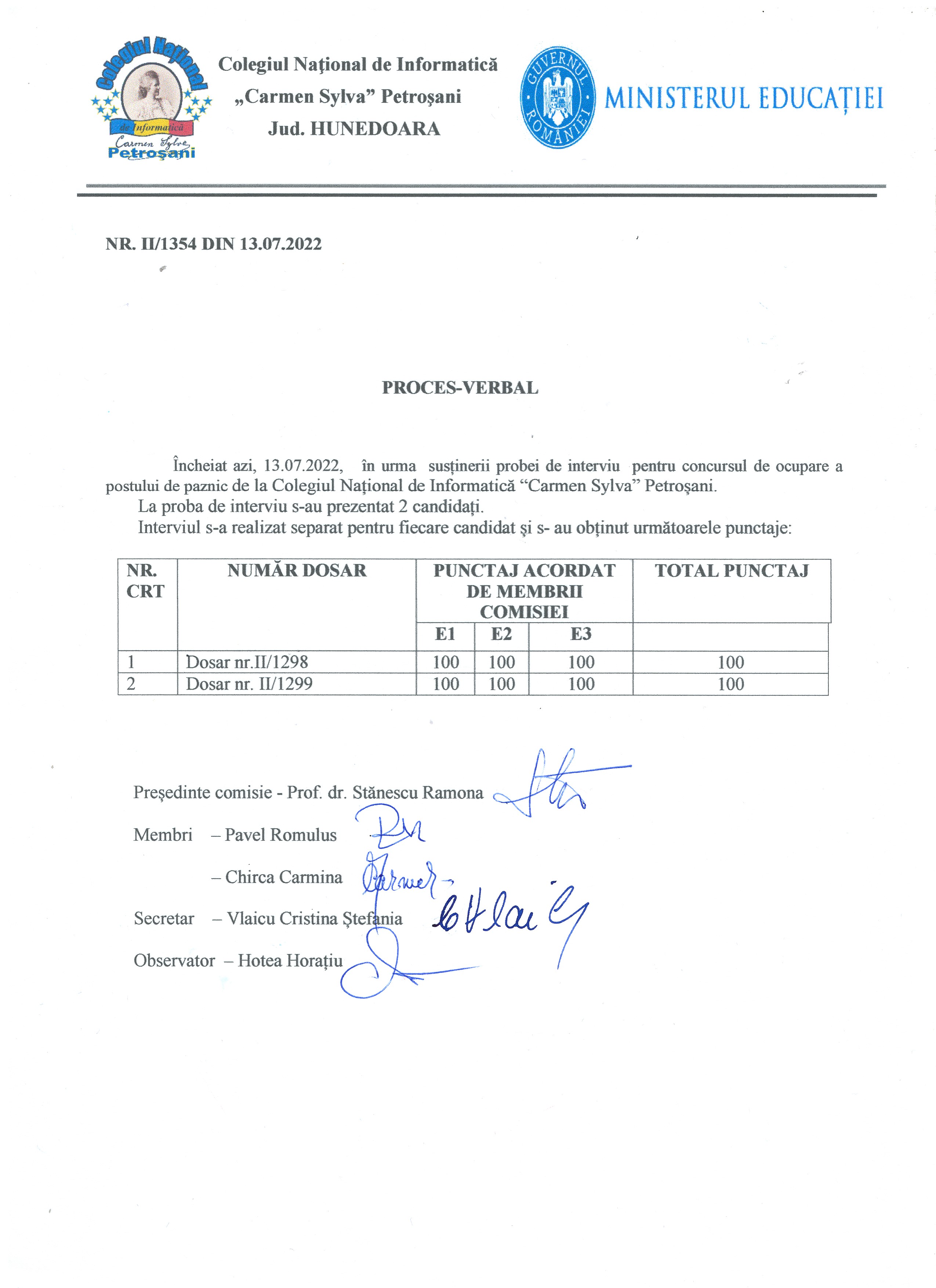 Colegiul Național de Informatică ”Carmen Sylva” Petroșani - rezultat proba de interviu pentru ocuparea unui post de paznic perioada nedeterminata