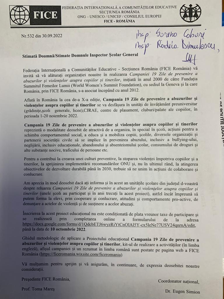 În conformitate cu adresa nr. 532/30.09.2022, Federația Internațională a Comunităților Educative – Secțiunea România (FICE România), vă invită să vă alăturați realizării Campaniei 19 Zile de prevenire a abuzurilor și violențelor asupra copiilor și tinerilor, inițiată în anul 2000, aflată acum la a XX-a ediție ce se va desfășura în unitățile de învățământ preuniversitar (grădinițe, școlei generale, licee), CJRAE, centre de plasament, palate și cluburi ale copiilor, în perioada 1-20 noiembrei 2022.