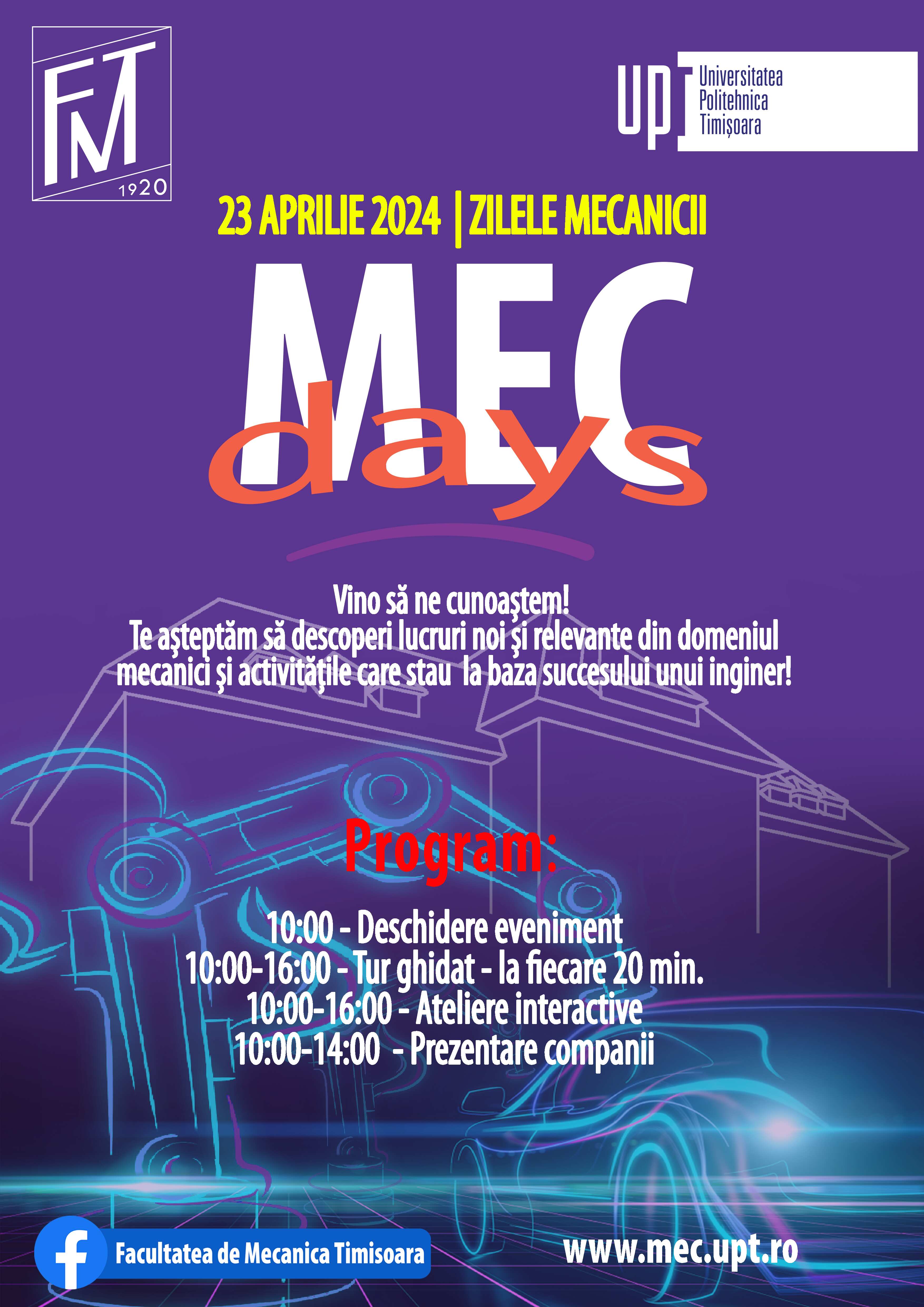 Facultatea de Mecanică din Timișoara organizează Evenimentul MecDays în data de 23 aprilie 2024. Evenimentul este asimilat unei activitati tip porti deschise si se desfasoara în perioada "Saptamanii altfel" pentru a inlesni participarea a cat mai multor elevi din clasele a XII-a.