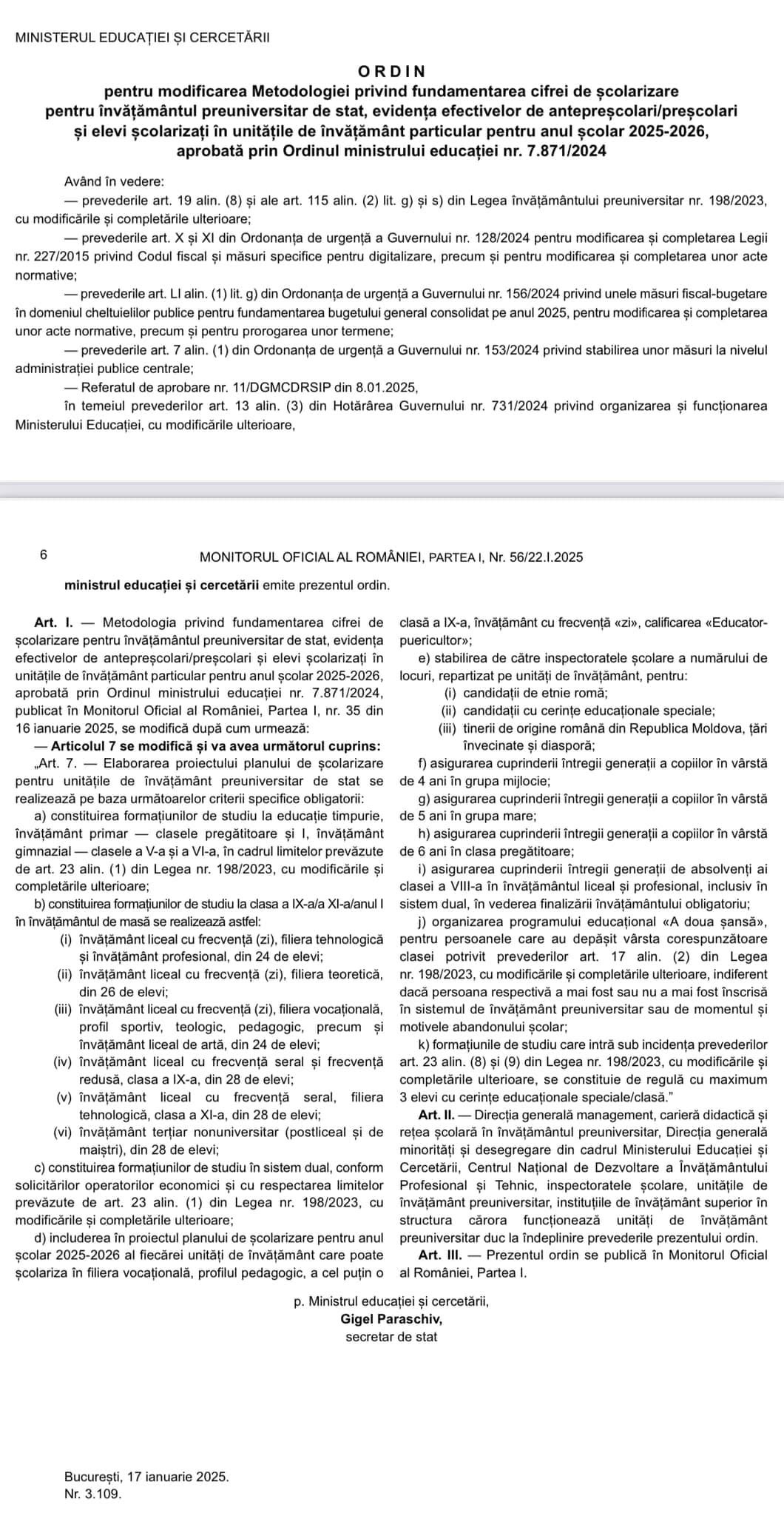 Ordin nr. 3.109. din 2025 al ministrului educației și cercetării pentru modificarea Metodologiei privind fundamentarea cifrei de școlarizare pentru învățământul preuniversitar de stat, evidența efectivelor de antepreșcolari/preșcolari și elevi școlarizați în unitățile de învățământ particular pentru anul școlar 2025-2026, aprobată prin Ordinul ministrului educației nr. 7.871/2024 (https://legislatie.just.ro/Public/Detal ... ent/293664)