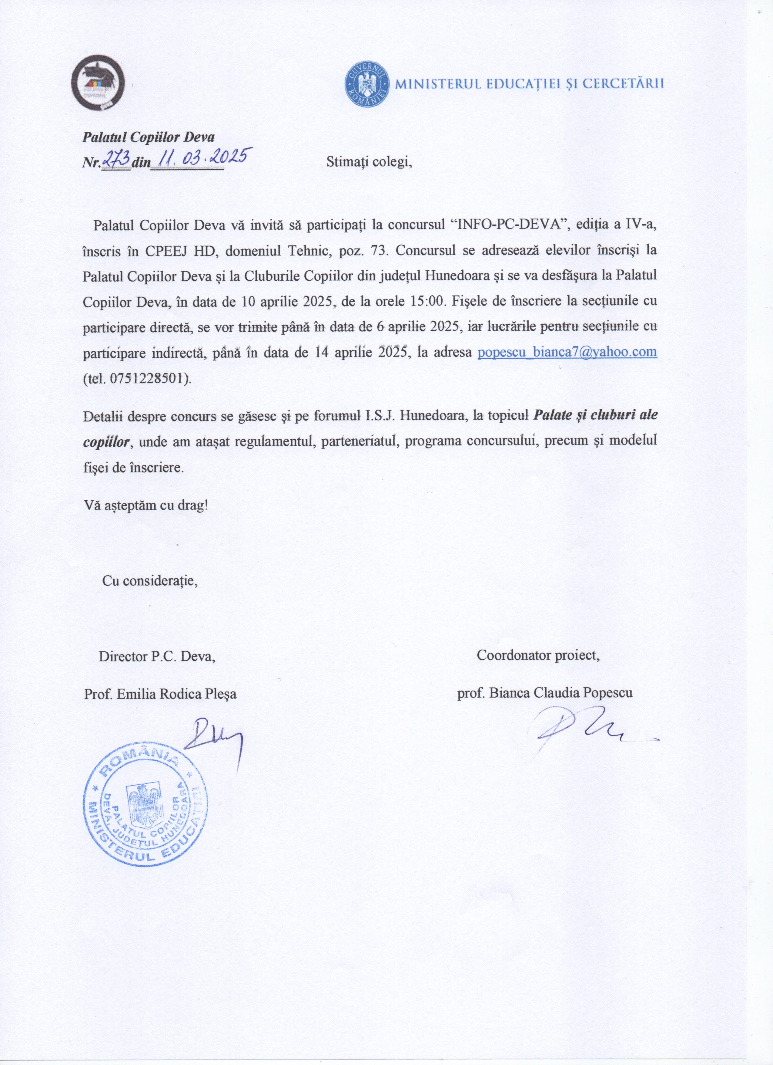 1. cu participare directă, care se va desfășura la Palatul Copiilor Deva, în data de 10 aprilie 2025, de la orele 15.