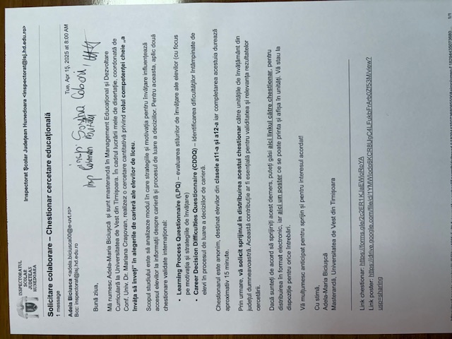 Prin urmare, vă solicit sprijinul în distribuirea acestui chestionar către unitățile de învățământ din județul dumneavoastră. Această contribuție ar fi esențială pentru validitatea și relevanța rezultatelor cercetării.