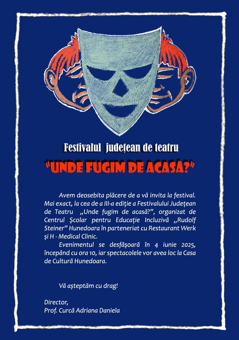 Centrul Şcolar pentru Educaţie Incluzivă "Rudolf Steiner" Hunedoara, vă invită să participaţi la FESTIVALUL INTERJUDEȚEAN DE TEATRU „UNDE FUGIM DE ACASĂ?” EDIŢIA a III - a 2025 - HUNEDOARA.