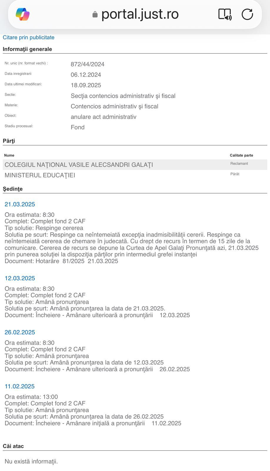 Prin Sentința civilă nr. 81/2025, pronunțată de Curtea de Apel Galați – Secția contencios administrativ și fiscal în dosarul nr. 872/44/2024, s-a respins acțiunea formulată de Colegiul Național „Vasile Alecsandri” Galați împotriva Ministerului Educației, privind anularea art. 17 din Ordinul ME nr. 5726/2024 (Regulamentul-cadru de organizare și funcționare a unităților de învățământ).