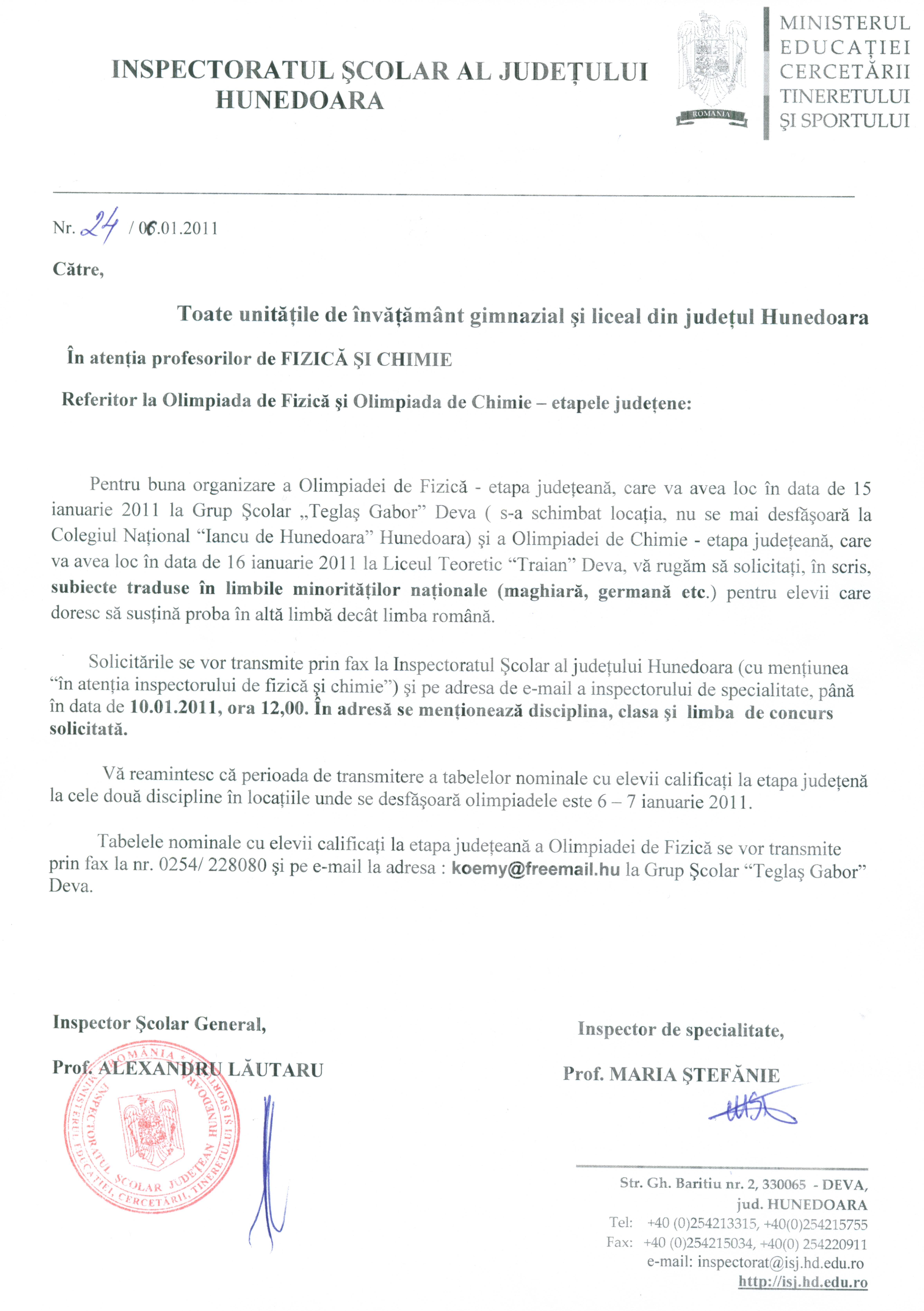 În fişierul ataşat este postată adresa ISJ Hunedoara cu nr. de înregistrare 24 din 06.01.2011, referitoare la OJF şi OJCh ( locaţii şi solicitări de subiecte traduse). Această adresă a fost transmisă şi prin secretariatele de zonă către toate unităţile de învăţământ gimnazial şi liceal.