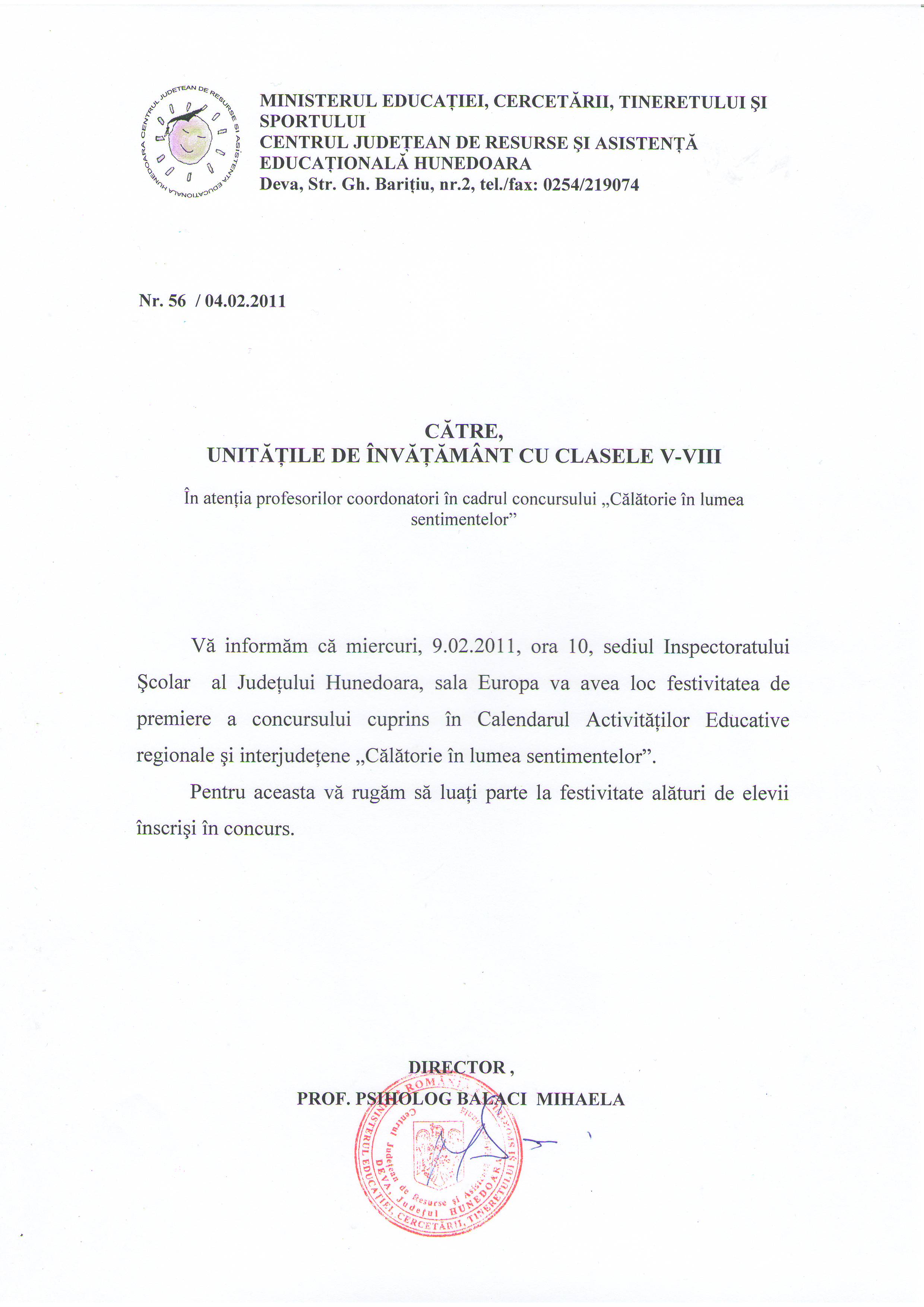 Vă informăm că în data de 9.02.2011 va avea loc festivitate de premiere a concursului "Calatorie in lumea sentimentelor". Pentru mai multe detalii consultaţi fisierul atatsat.