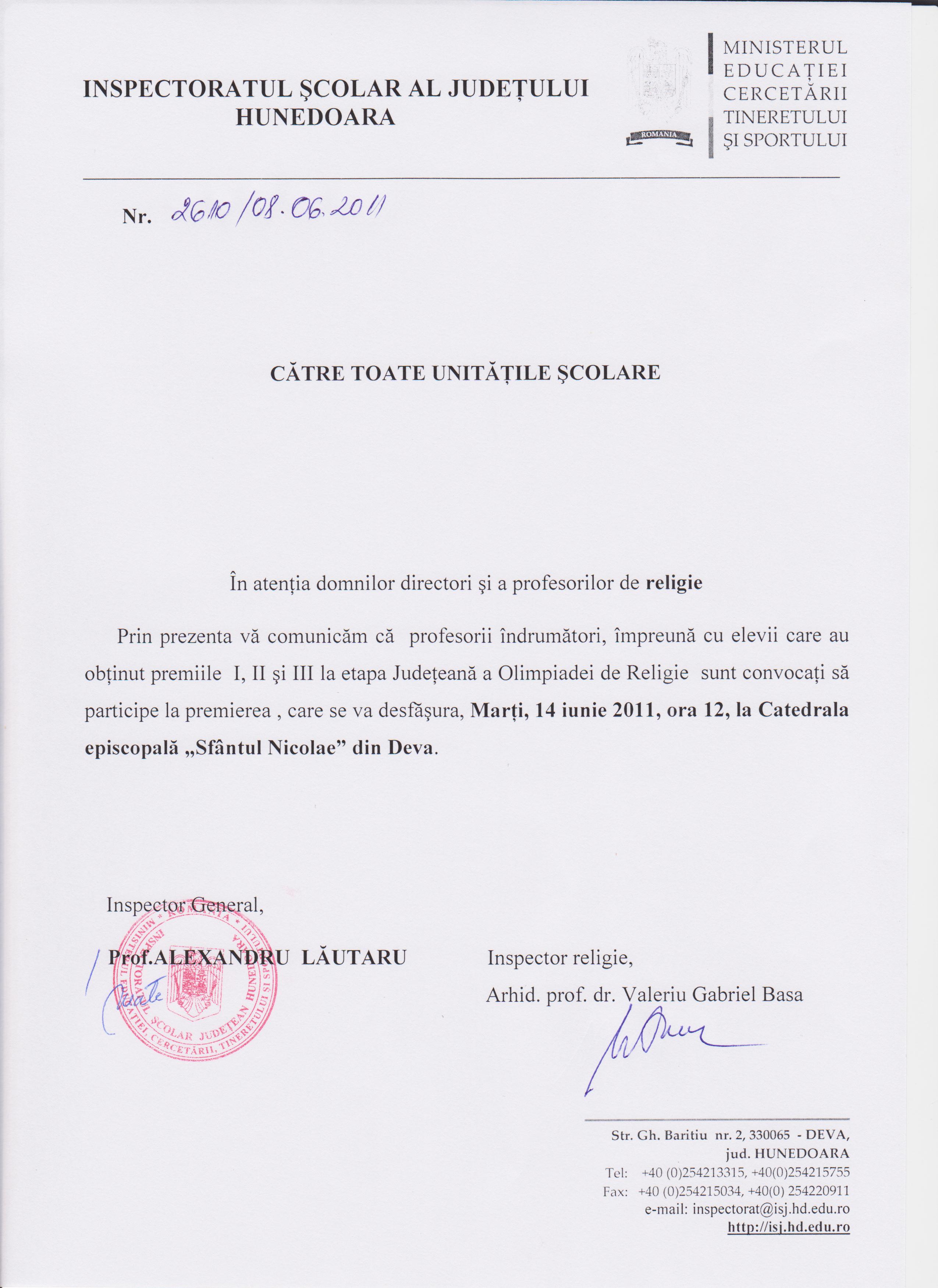 în fişierul ataşat se află scanată adresa referitoare la festivitatea de premiere a elevilor care au obţinut locurile I, II şi III la etapa judeţeană a Olimpiadei de Religie ortodoxă. Aceasta se va desfăşura MARŢI, 14 iunie 2011, ora 12, la Catedrala episcopală "Sfântul Nicolae" din Deva