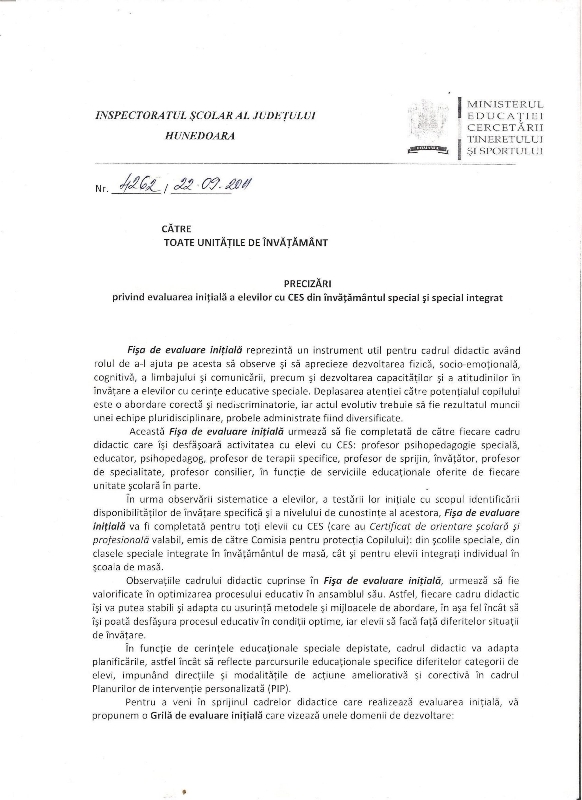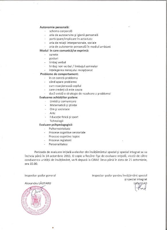 In documentul ataşat găsiţi Precizările cu privire la evaluarea elevilor cu CES din învăţământul special şi special integrat şi FIŞA DE EVALUARE INIŢIALĂ. Aceasta va fi completată pentru fiecare elev cu CES, iar o copie a acesteia, vizată de conducătorul unităţii şcolare, va fi depusă la CJRAE până în data de 21 octombrie.