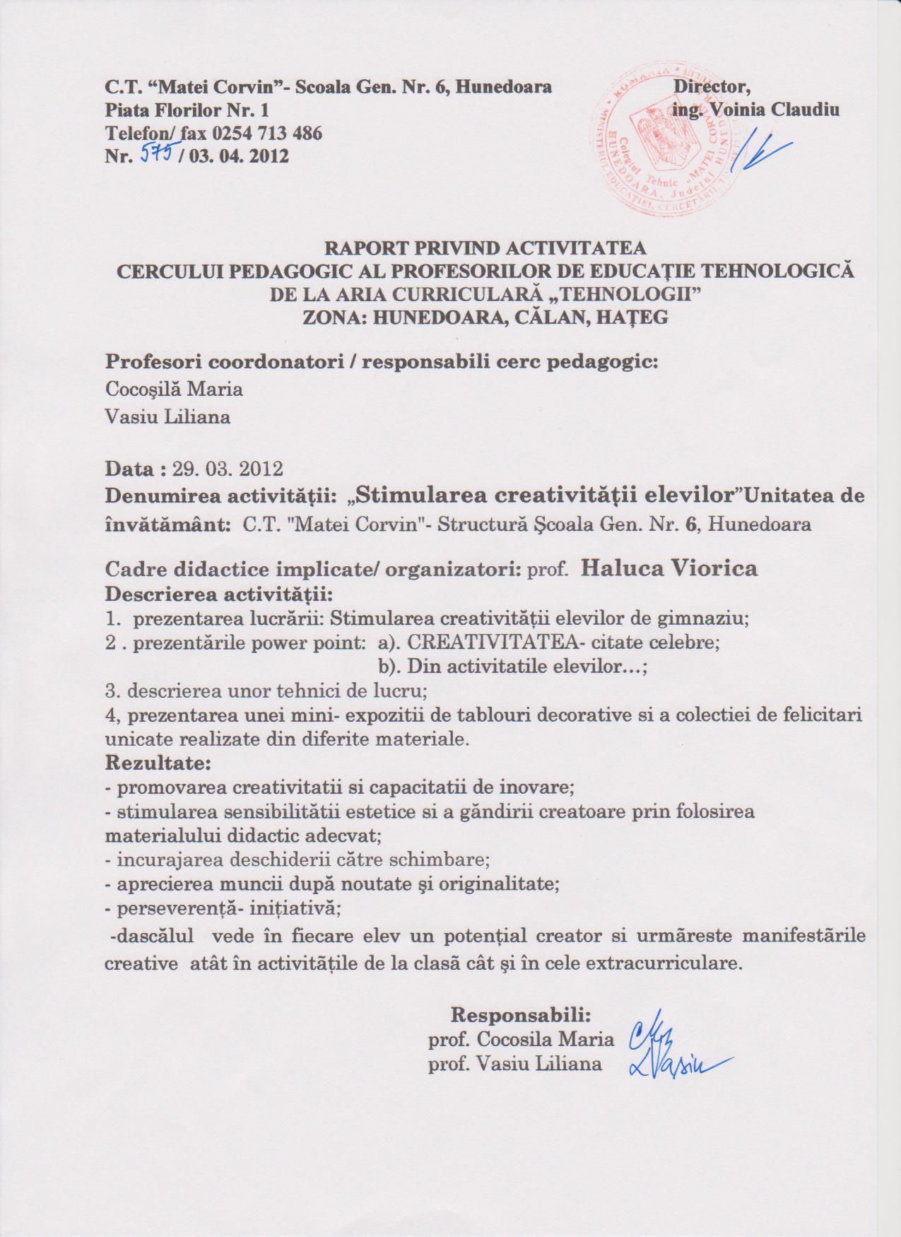 Vă anunţăm că, în data de 29 martie a.c., ora 13, conform graficului activităţilor cercului pedagogic, la C.T. "M. Corvin"- Structură Şcoala Gen. Nr. 6 din Hunedoara se va desfăşura activitatea metodică: Stimularea creativitatii elevilor de gimnaziu- destinată cadrelor didactice care predau disciplina Educaţie Tehnologică.
