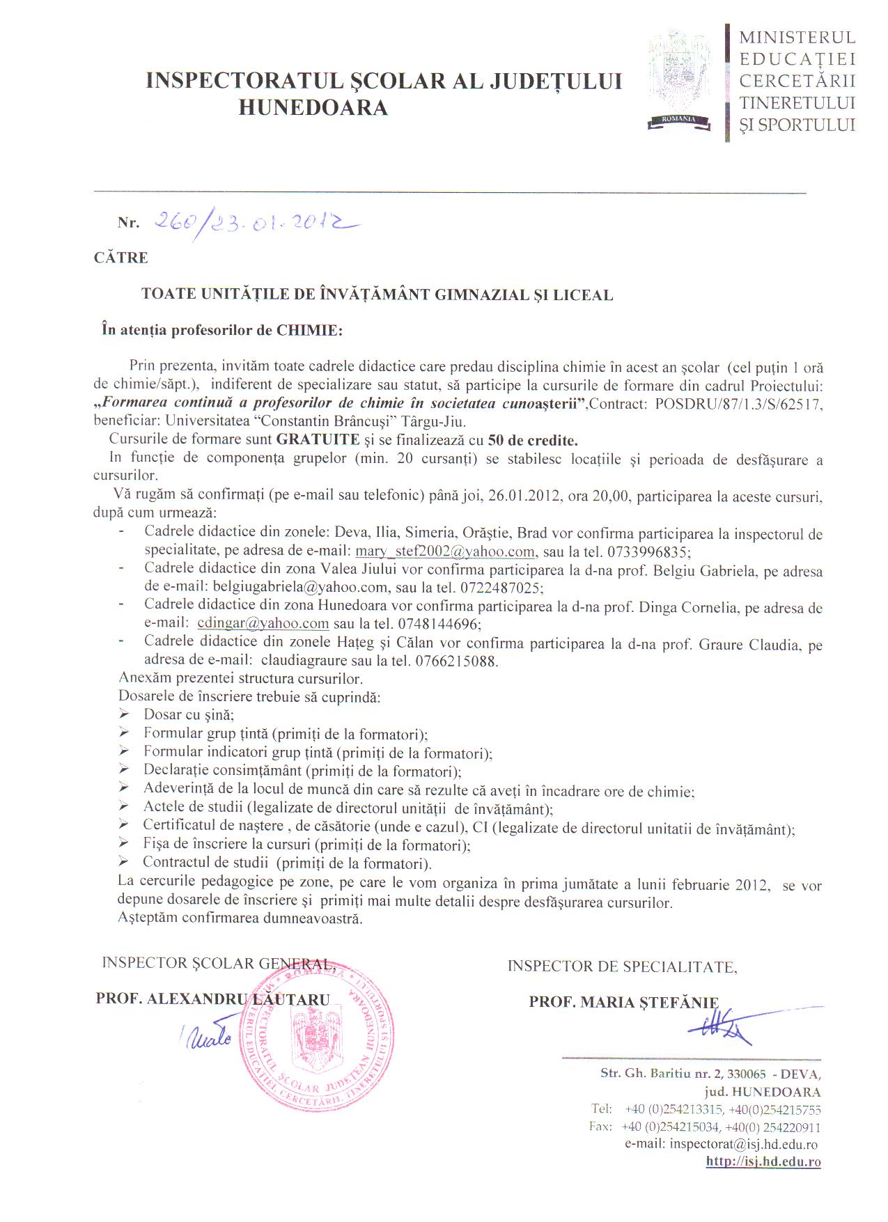 In fişierul ataşat este postată adresa ISJ Hunedoara nr. 260/23.01,2012, referitoare la organizarea şi desfăşurarea cursurilor de formare din cadrul proiectului "Formarea continuă a profesorilor de Chimie în societatea cunoaşterii", Contract nr. POSDRU/87/1.3/S/62517.