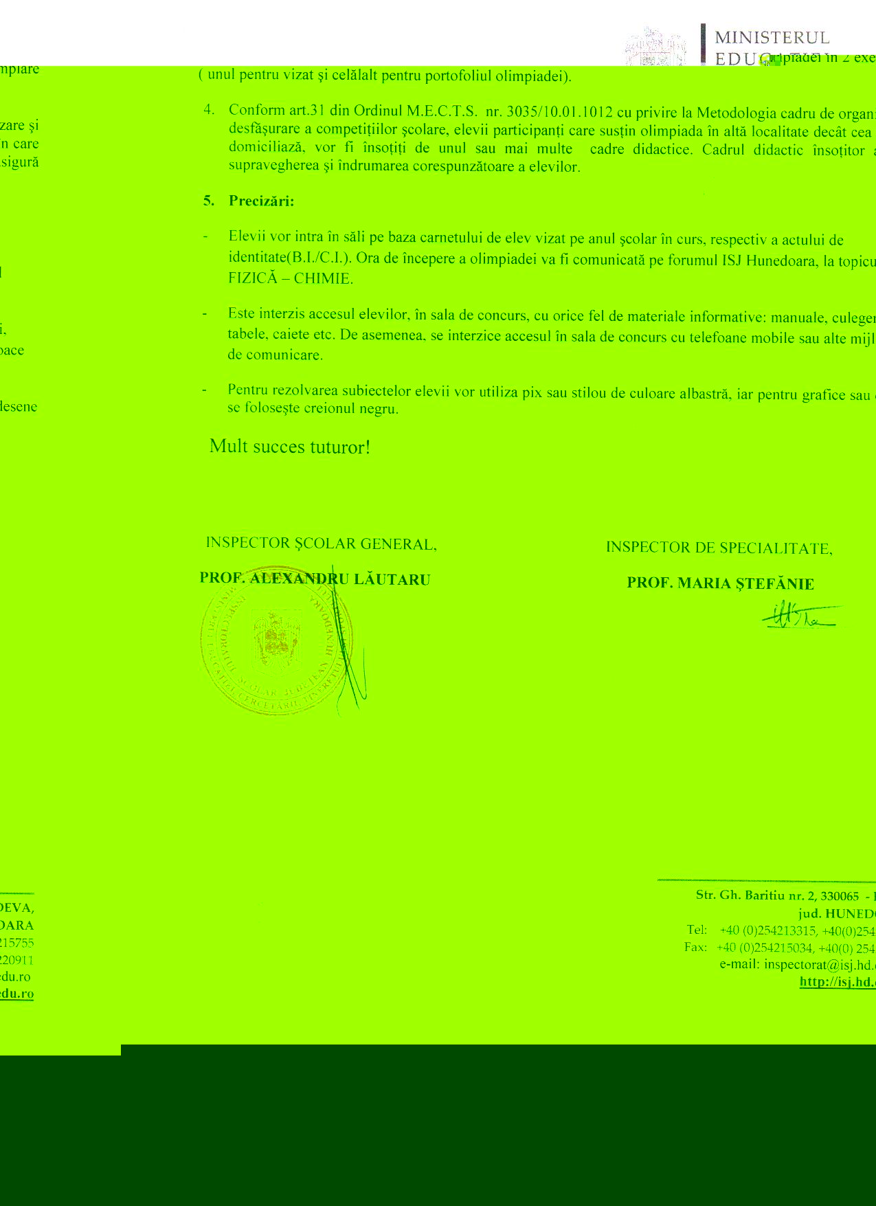 In fişierele ataşate este postată adresa ISJ Hunedoara nr. 256/23.01.2012, referitoare la Olimpiada de Fizică. Această adresă a fost transmisă prin zone către toate unităţile şcolare de nivel gimnazial şi liceal din judeţ.
