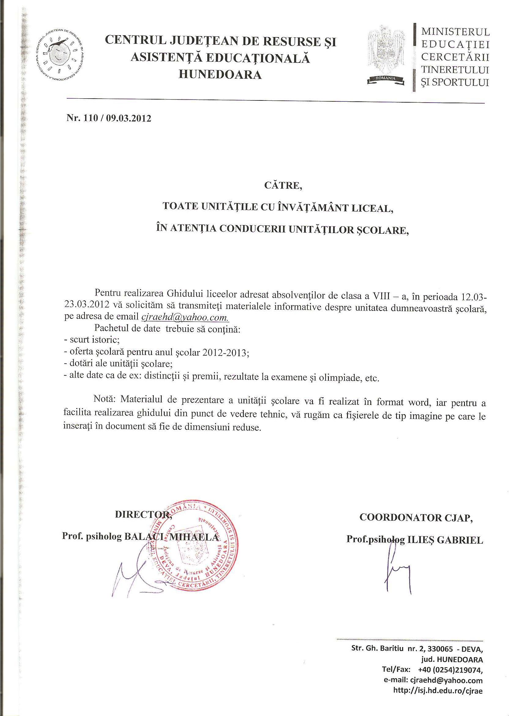 a VIII a, in acest sens va rugam sa ne transmiteti materialele informative conform adresei anexate.