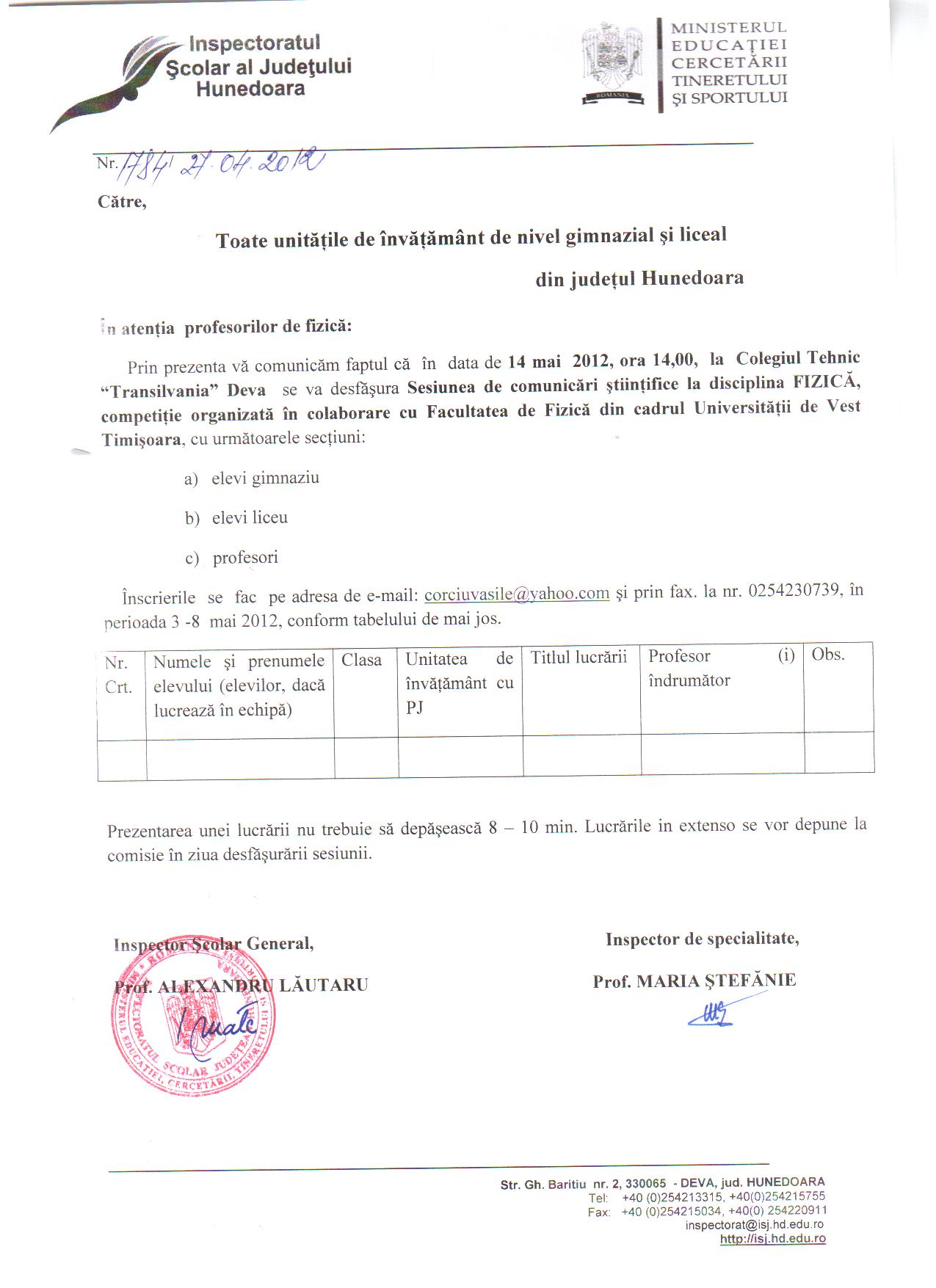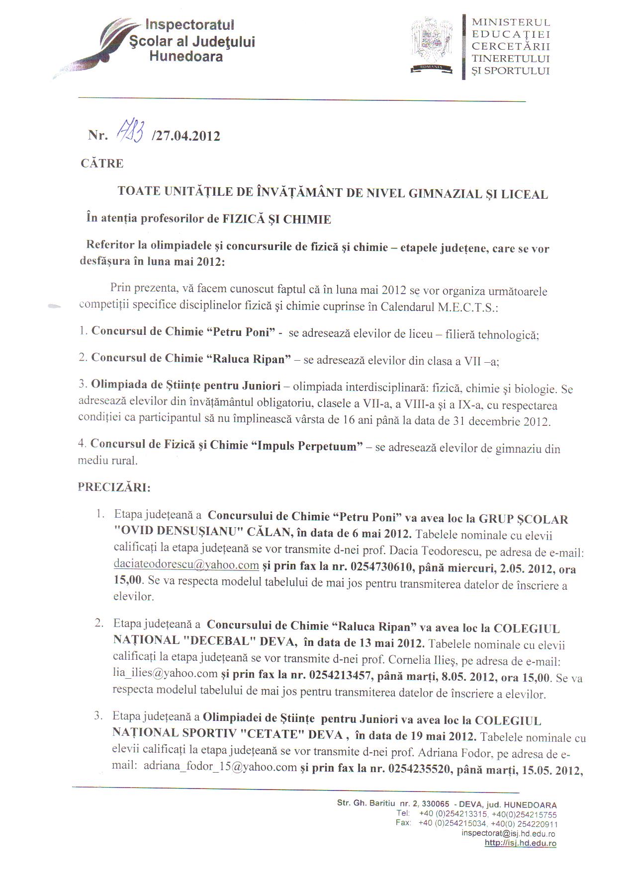 În fişierele ataşate sunt postate adresele ISJ Hunedoara referitoare la organizarea concusurilor şi a sesiunilor de comunicări ştiinţifice pentru disciplinele fizică şi chimie din luna mai 2012, etape judeţene. Adresele au fost înaintate unităţilor şcolare, prin fax.