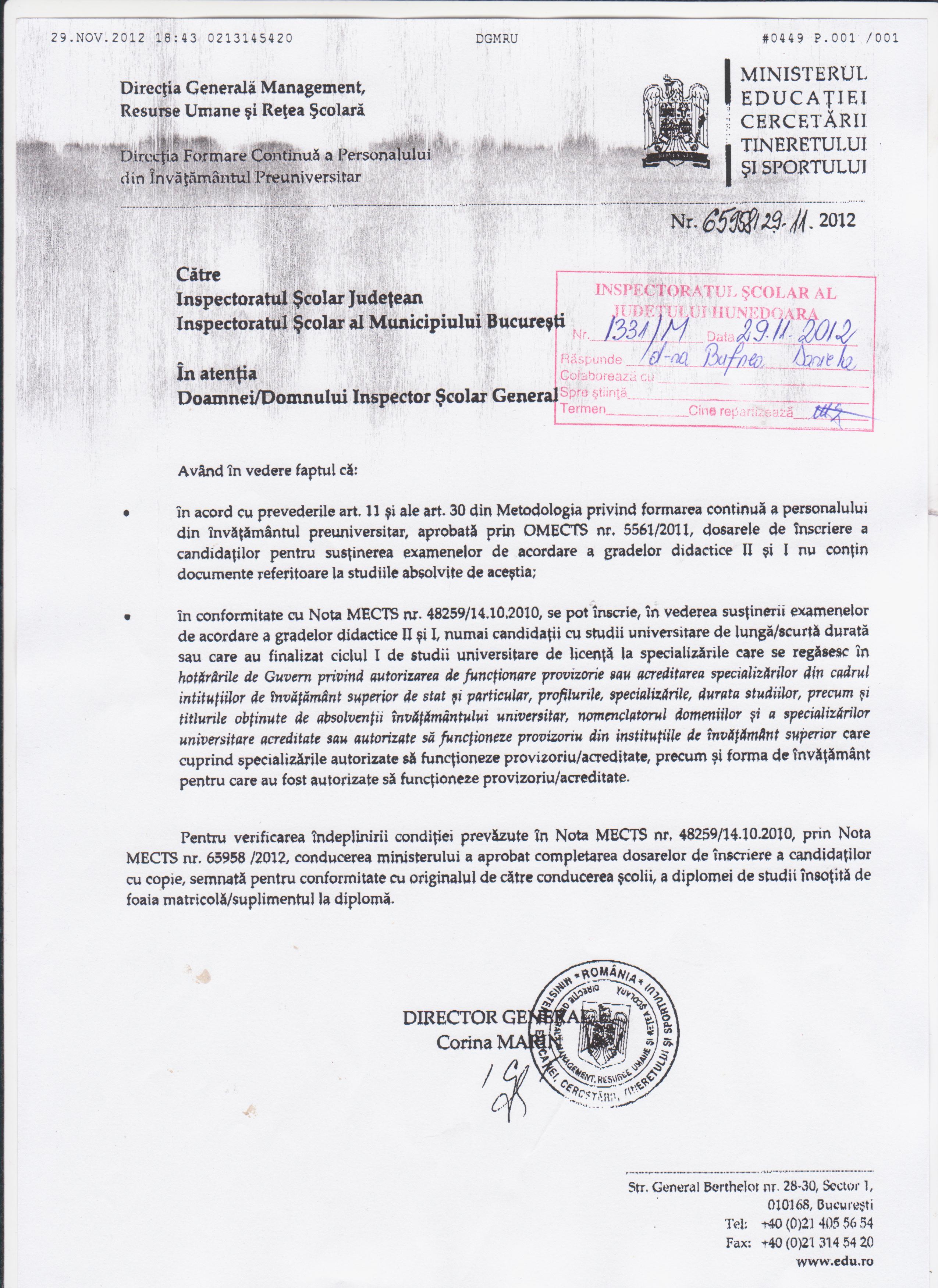 Dat fiind faptul ca a fost trimisa Nota MECTS nr.65958/29.11.2012, cadrele didactice inscrise la Gradul didactic I seria 2013/2015 vor completa dosarele de inscriere depuse in perioada 1 - 31 octombrie 2012, cu urmatoarele documente: