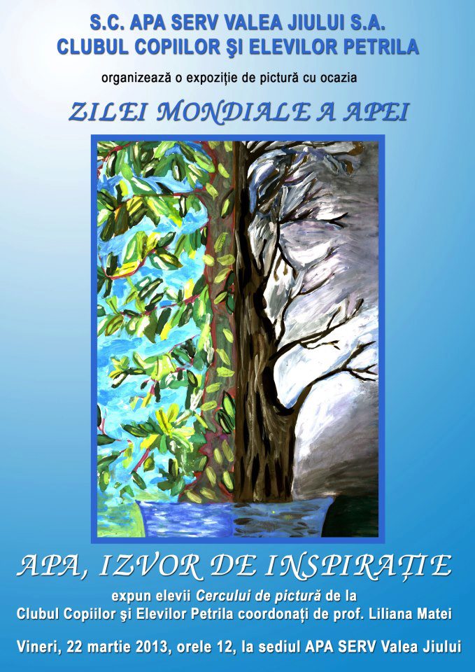 În data de 22 martie 2013, copiii de la cercul de pictură coordonaţi de doamna profesor Liliana Matei, de la Clubul Copiilor şi Elevilor Petrila au organizat la S.C.Apa Serv Valea Jiului S.A. o expoziţie de pictură cu titlul ,, Apa izvor de inspiraţie ’’ , cu ocazia Zilei Mondiale a Apei.