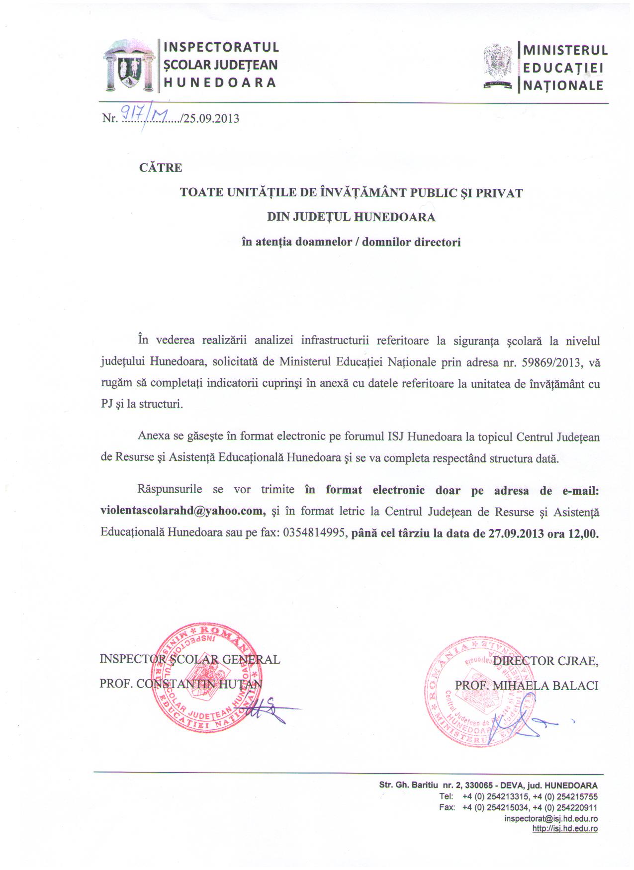 În vederea realizării analizei infrastructurii referitoare la siguranţa şcolară la nivelul judeţului Hunedoara, solicitată de Ministerul Educaţiei Naţionale prin adresa nr. 59869/2013, vă rugăm să completaţi indicatorii cuprinşi în anexă cu datele referitoare la unitatea de învăţământ cu PJ şi la structuri.