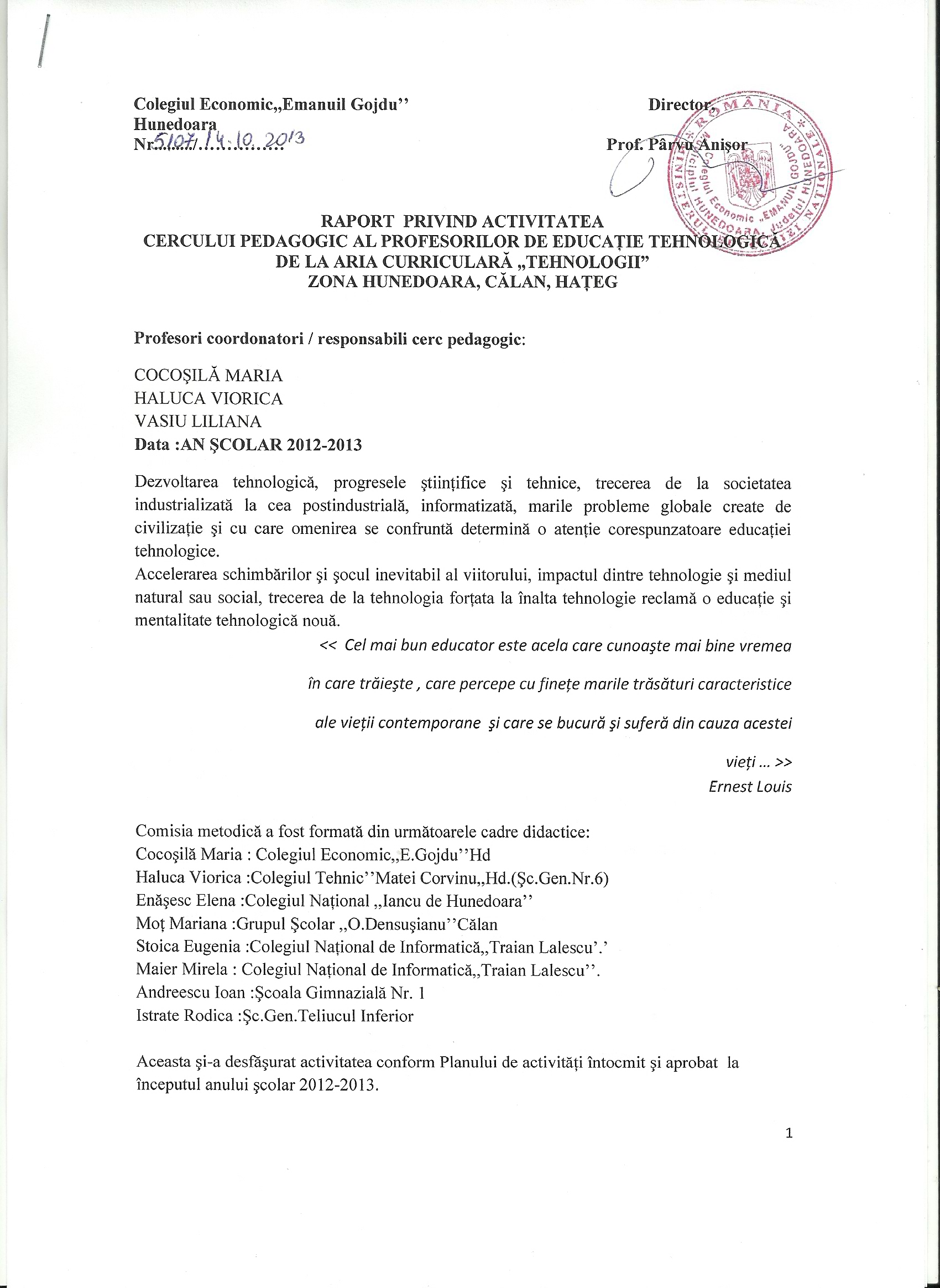 1. Raportul privind activitatea comisiei metodice a profesorilor de educatie tehnologică zona Hunedoara, Călan, Haţeg în luna martie 2013.