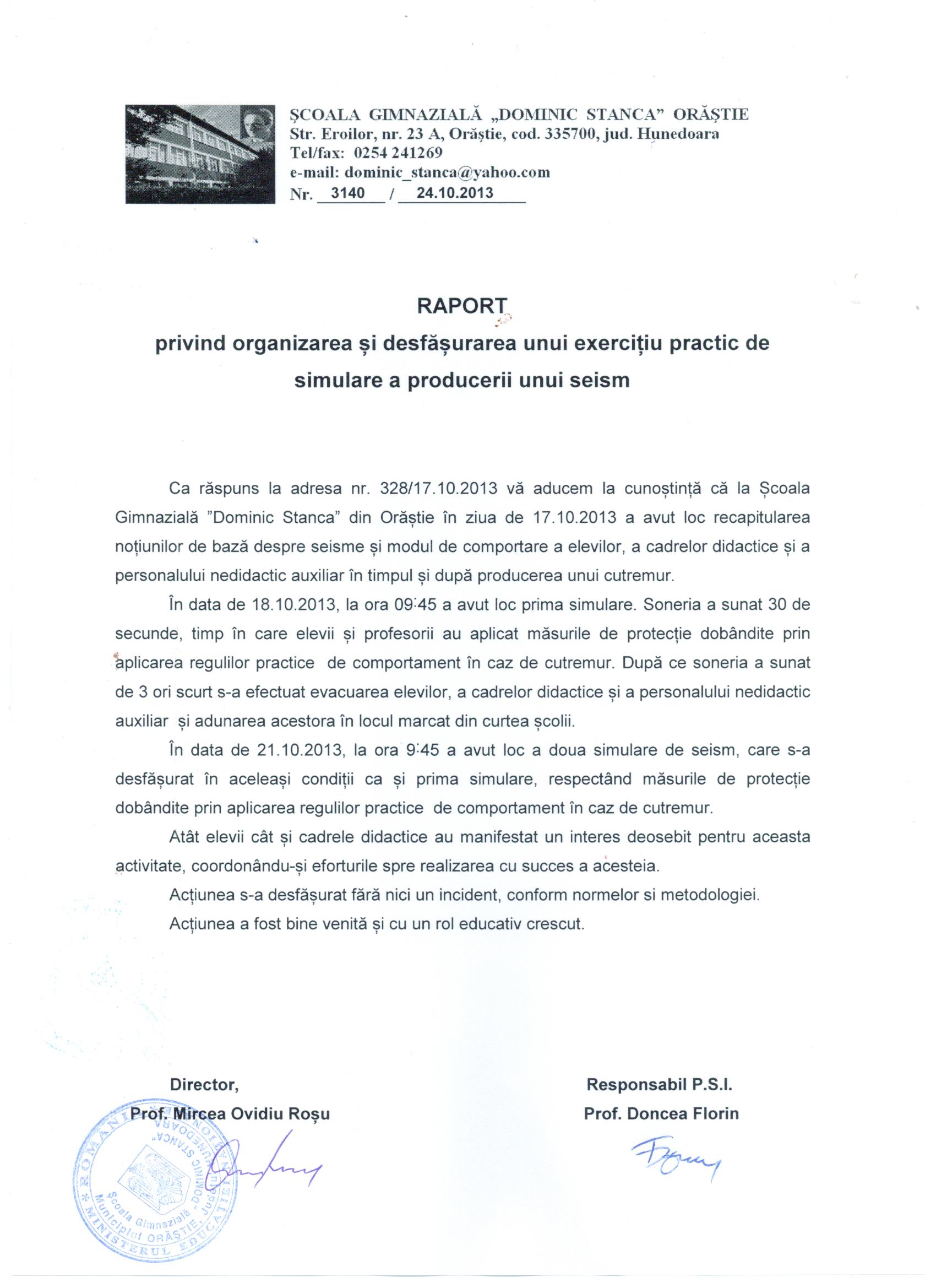 Va atasam raportul referitor la exercitiile de simulare a unui cutremur.