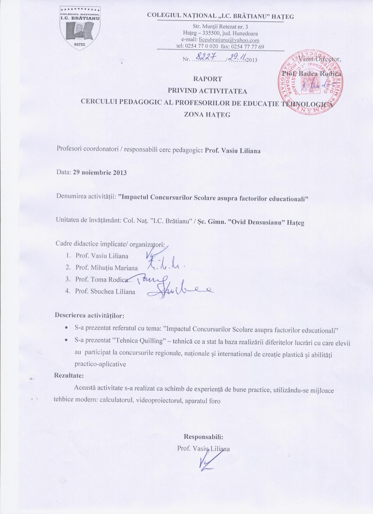 1. Raportul privind activitatea comisiei metodice a profesorilor de educatie tehnologică zona Hunedoara, Călan, Haţeg în luna martie 2013.