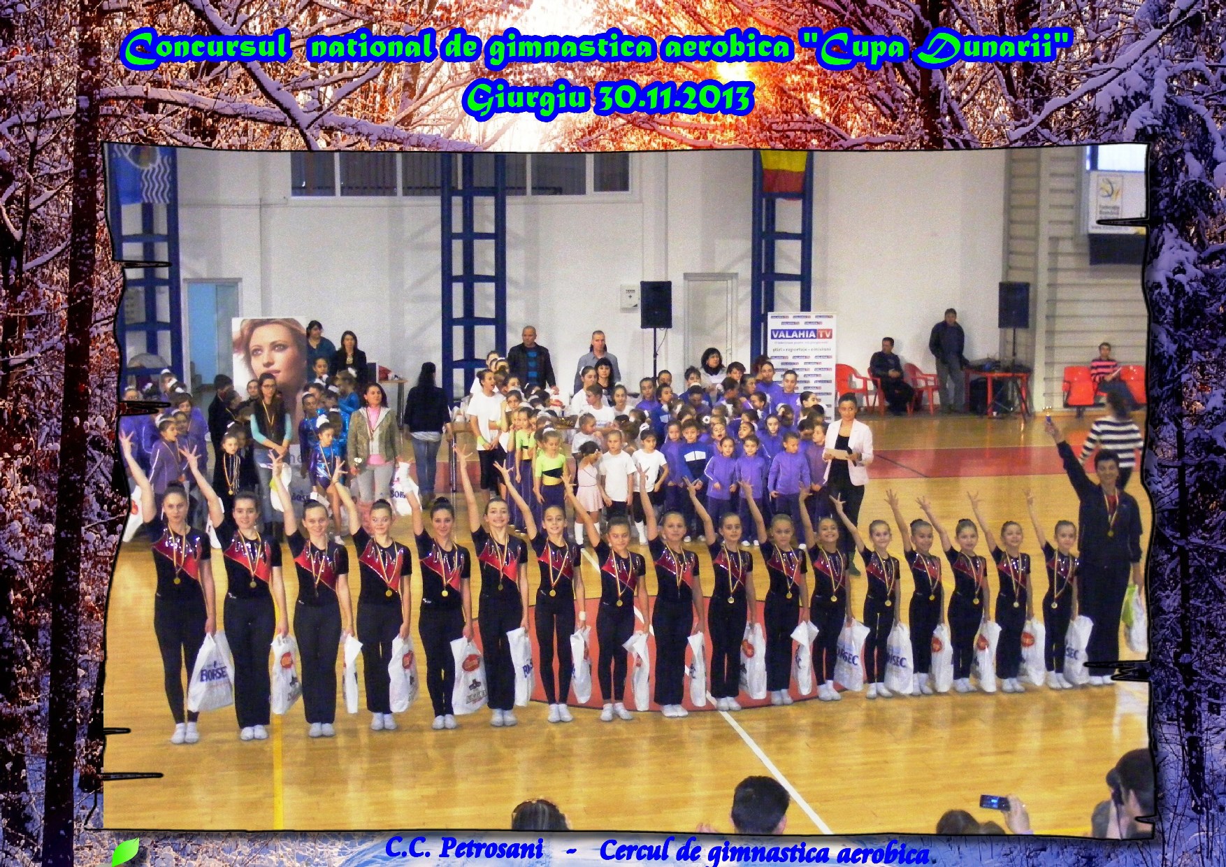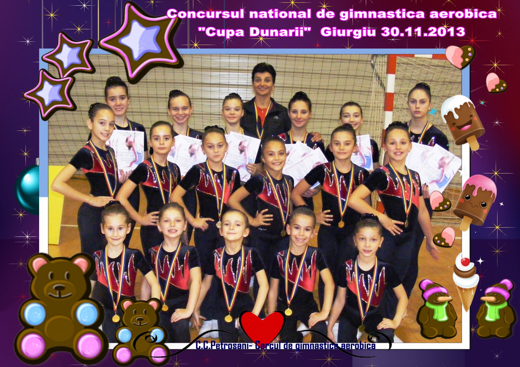 *In perioada 29.11-01.12 2013 lotul de gimnasti de la Cercul de gimnastica aerobica - Clubul Copiilor Petrosani a participat la Concursul National de Gimnastica Aerobica "Cupa Dunarii" de la Giurgiu.La acest concurs au participat copiii de la grupa de performanta cu varste cuprinse intre 5 si 12 ani).