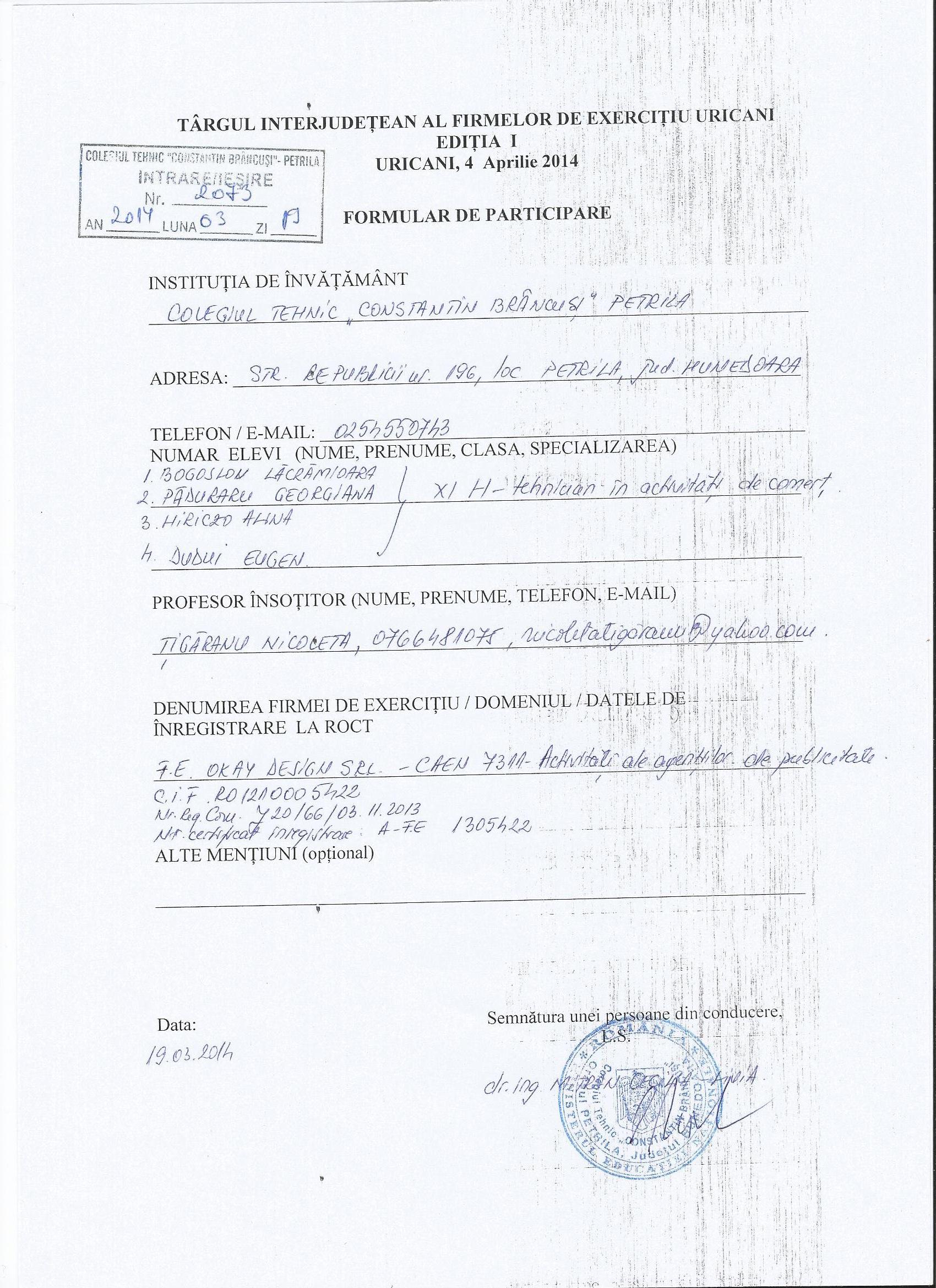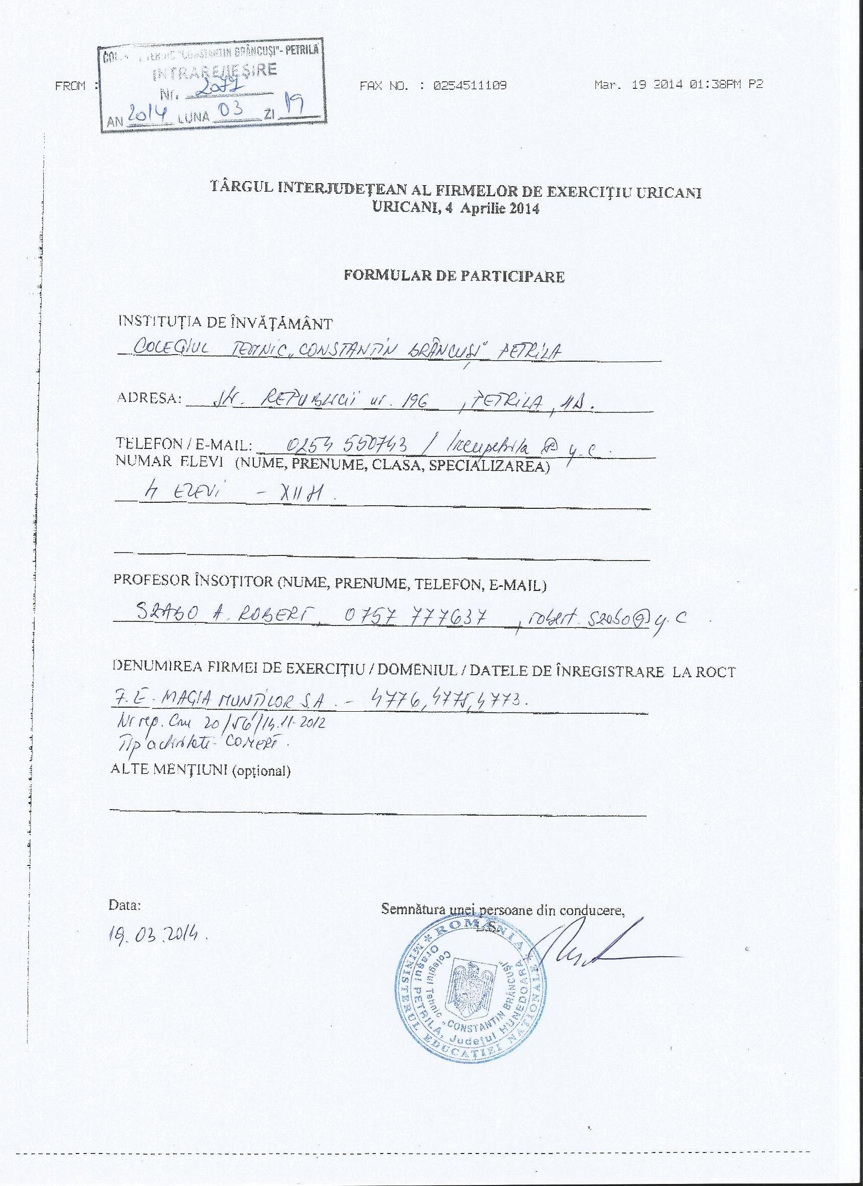 Re: TÂRGUL REGIONAL AL FIRMELOR DE EXERCIȚIU - 2014