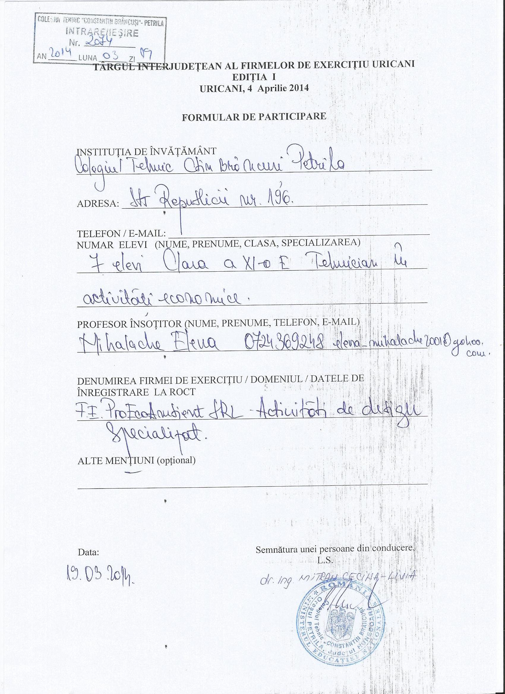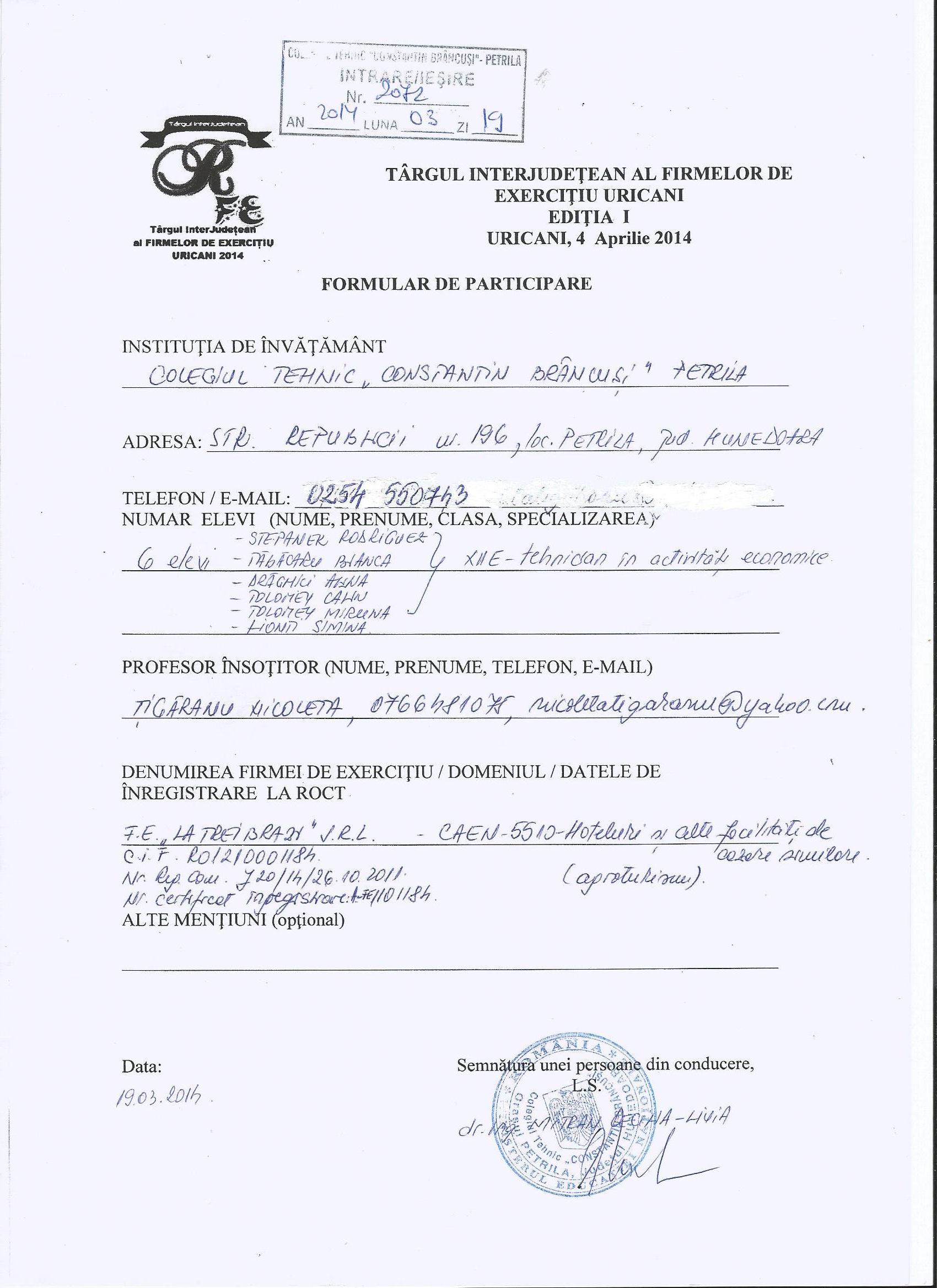 Data limită de înscriere a firmelor de exerciţiu este 31.03.2014, ora 14:00 şi se face prin completarea formularului de participare şi prin trimiterea acestuia scanat pe adresa de e-mail: targinterjudeteanuricani@yahoo.com
