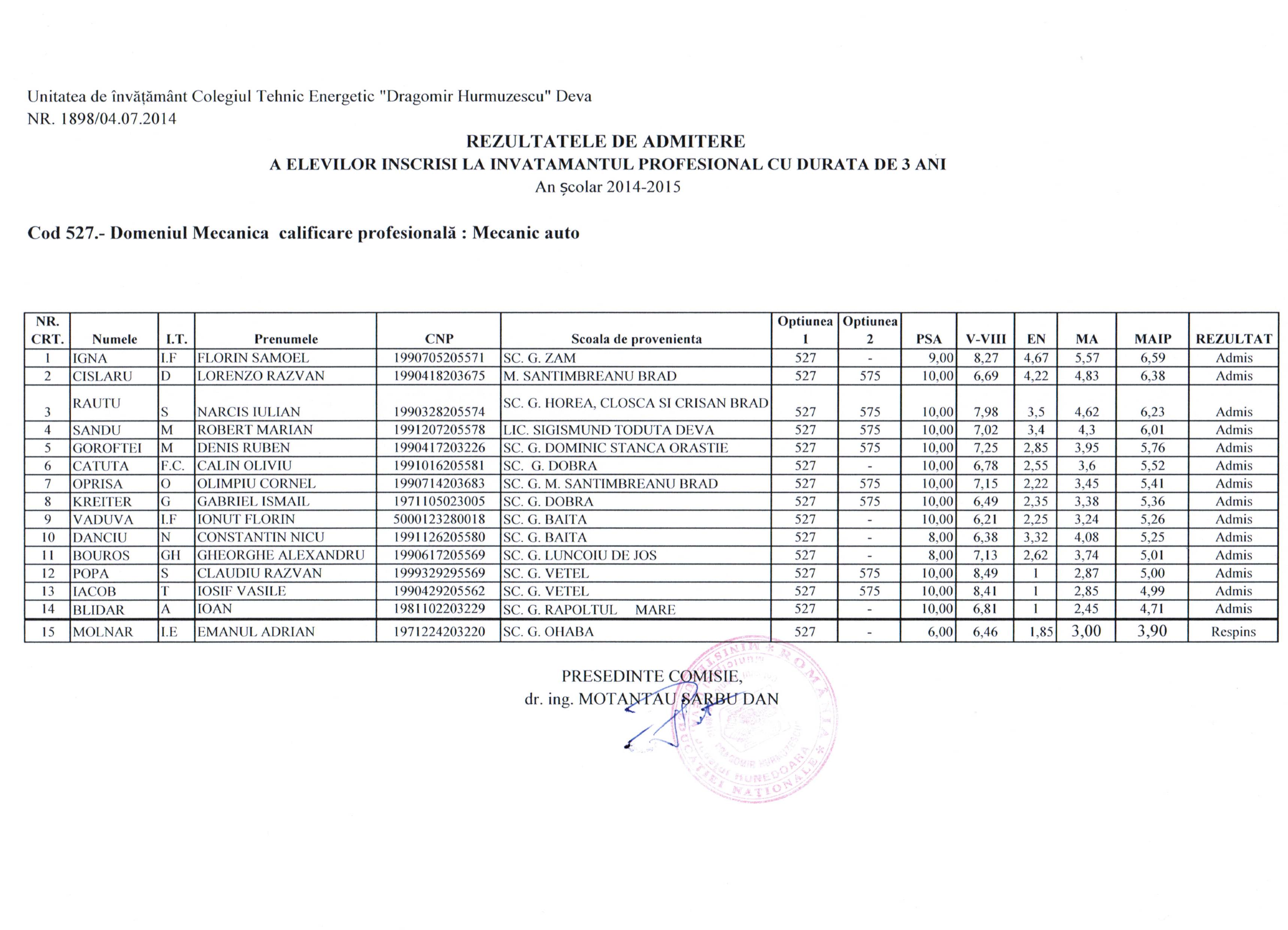 Liceul Tehnologic Constantin Bursan Hunedoara LISTA ADMISI SC.PROFESIONALA DE 3 ANI Electromecanic.xls- (38.5 KiB) Descărcat de 220 ori