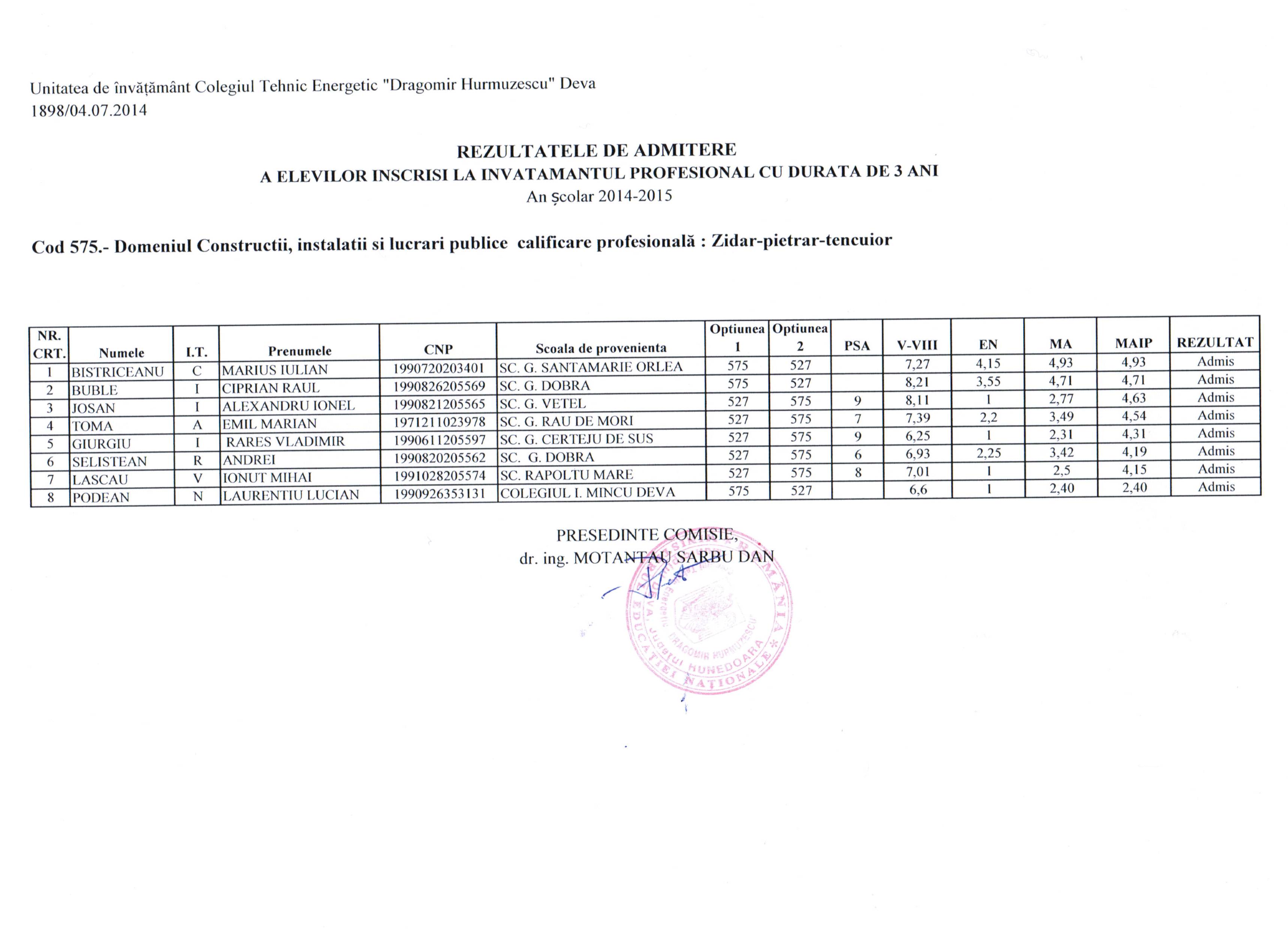 LISTA ADMISI SCOALA PROFESIONALA DE 3 ANI, ETAPA I, AN SCOLAR 2014 - 2015.