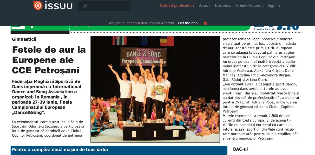 * Este primul titlu european care se adauga la bogatul palmares al gimnastelor de la Clubul Copiilor din Petrosani.