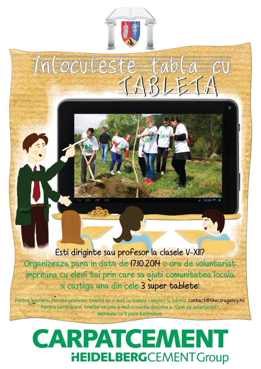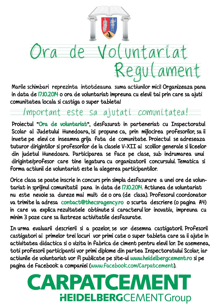 Carpatcement - Heidelberg Cement Group, organizează concursul Ora de voluntariat, ediţia a II-a. Ora de voluntariat trebuie desfăşurată până cel tâziu 17.10.2014. Concursul constă în trimiterea unei scurte descrieri a activităţii însoţită de minim 3 fotografii.Ţinând cont de faptul că prima ediţie a înregistrat un real succes, vă invit să participaţi! Afişul şi regulamentul le găsiţi în ataşament.