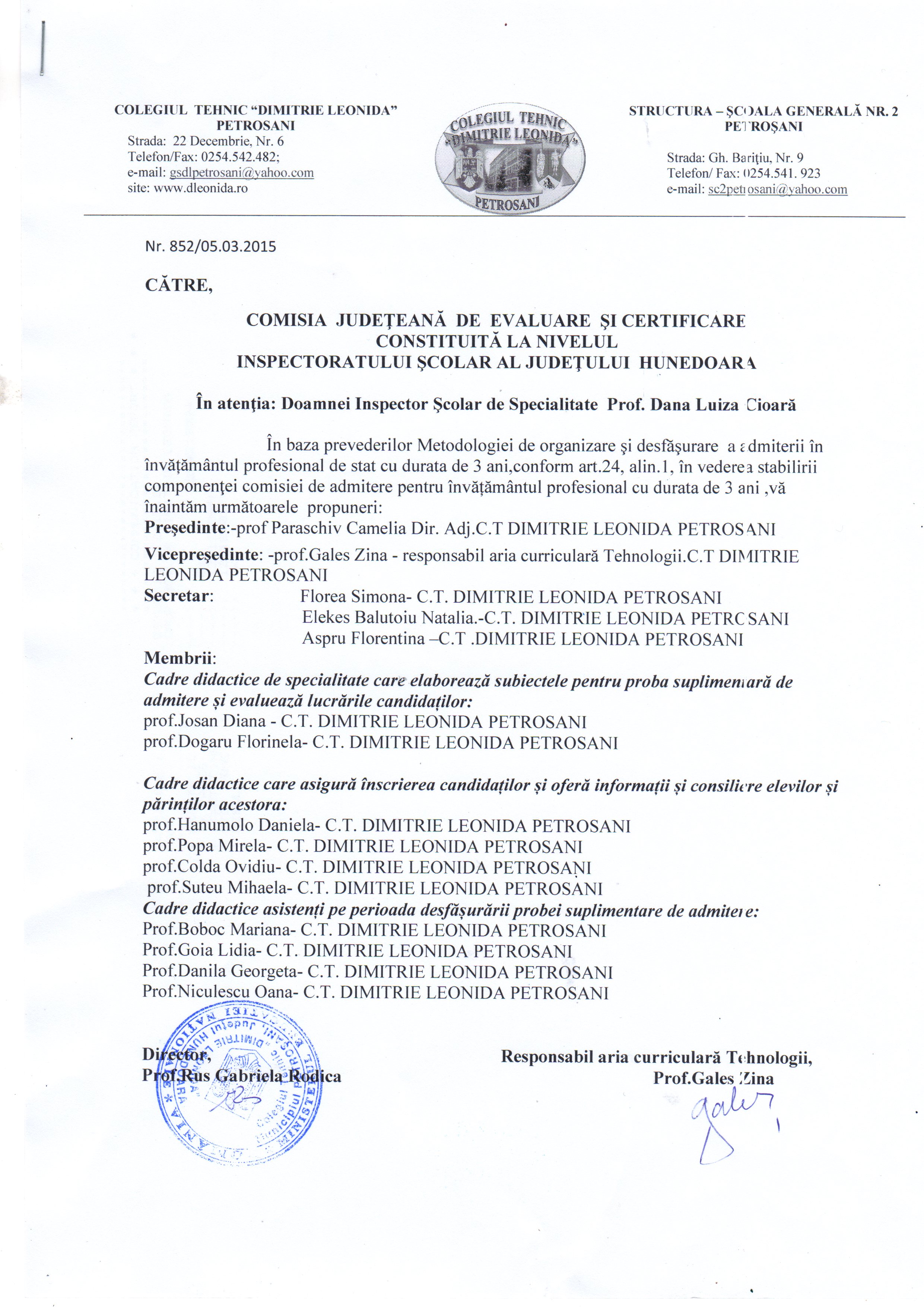 Liceul Tehnologic "Grigore Moisil" Deva, comisia de asmitere I.P. de 3 ani