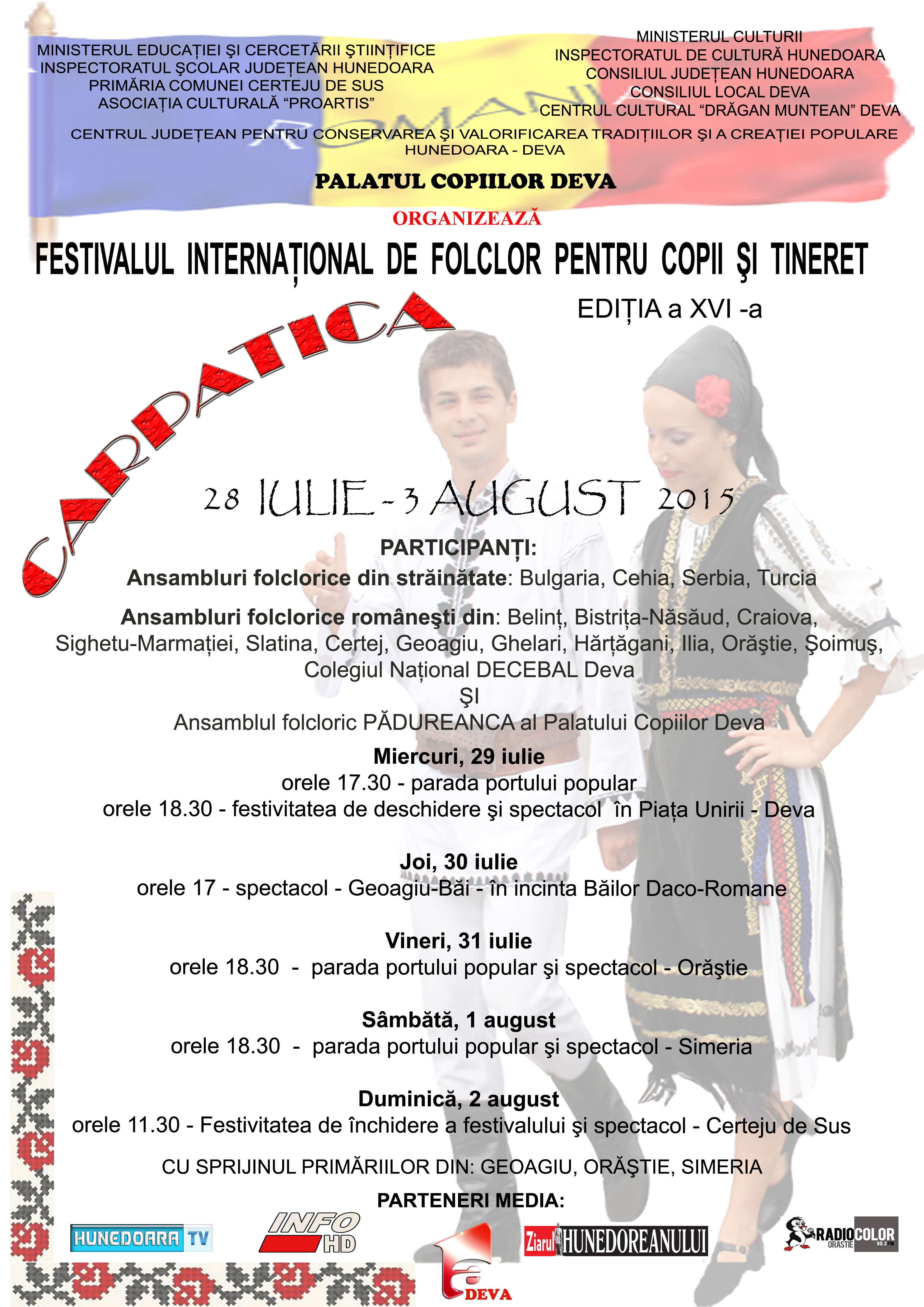 În perioada 28 iulie - 3 august 2015, Palatul Copiilor din Deva organizează a XVI-a ediţie a Festivalului Internaţional de Folclor pentru Copii şi Tineret CARPATICA. Gazda festivalului, ansamblul folcloric PĂDUREANCA al Palatului Copiilor, coordonat de domnul profesor Dumitru Lăsconi, va invită să vizionaţi pe parcursul acestei perioade, spectacole susţinute de ansambluri folclorice din Bulgaria, Cehia, Serbia, Belinţ-TM, Bistriţa Năsăud, Craiova-DJ, Sighetu-Marmaţiei, Slatina, Certej, Geoagiu, Ghelari, Hărţăgani, Ilia, Orăştie, Şoimuş, Deva. Parada portului, cântecului şi dansului popular şi spectacolul de deschidere al Festivalului, vor avea loc miercuri - 29 iulie, începând cu ora 17.30, la Deva în Piaţa Unirii.