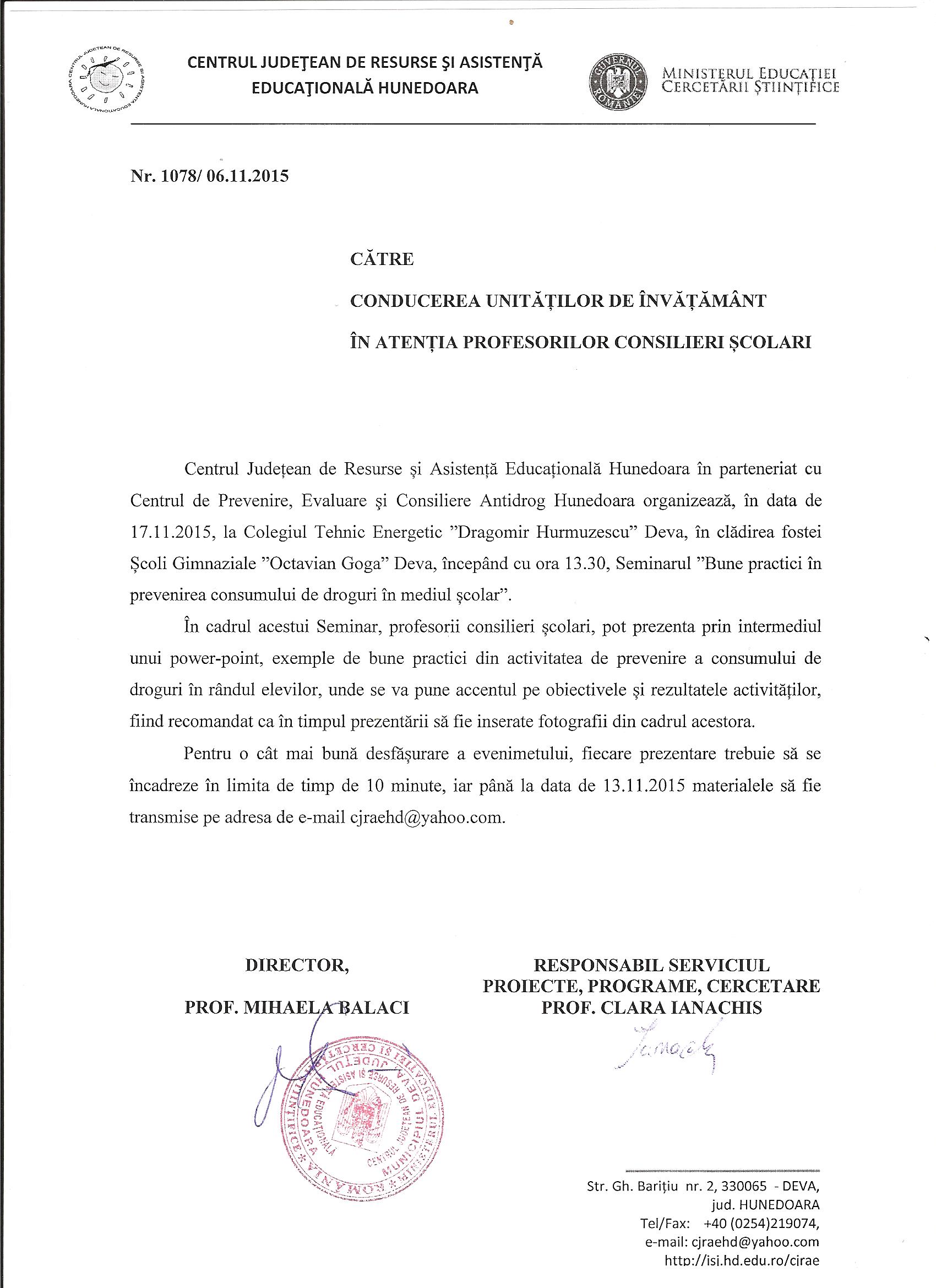 Centrul Județean de Resurse și Asistență Educațională Hunedoara în parteneriat cu Centrul de Prevenire, Evaluare şi Consiliere Antidrog Hunedoara organizează, în data de 17.11.2015, la Colegiul Tehnic Energetic ”Dragomir Hurmuzescu” Deva, în clădirea fostei Școli Gimnaziale ”Octavian Goga” Deva, începând cu ora 13.30, Seminarul ”Bune practici în prevenirea consumului de droguri în mediul școlar”.