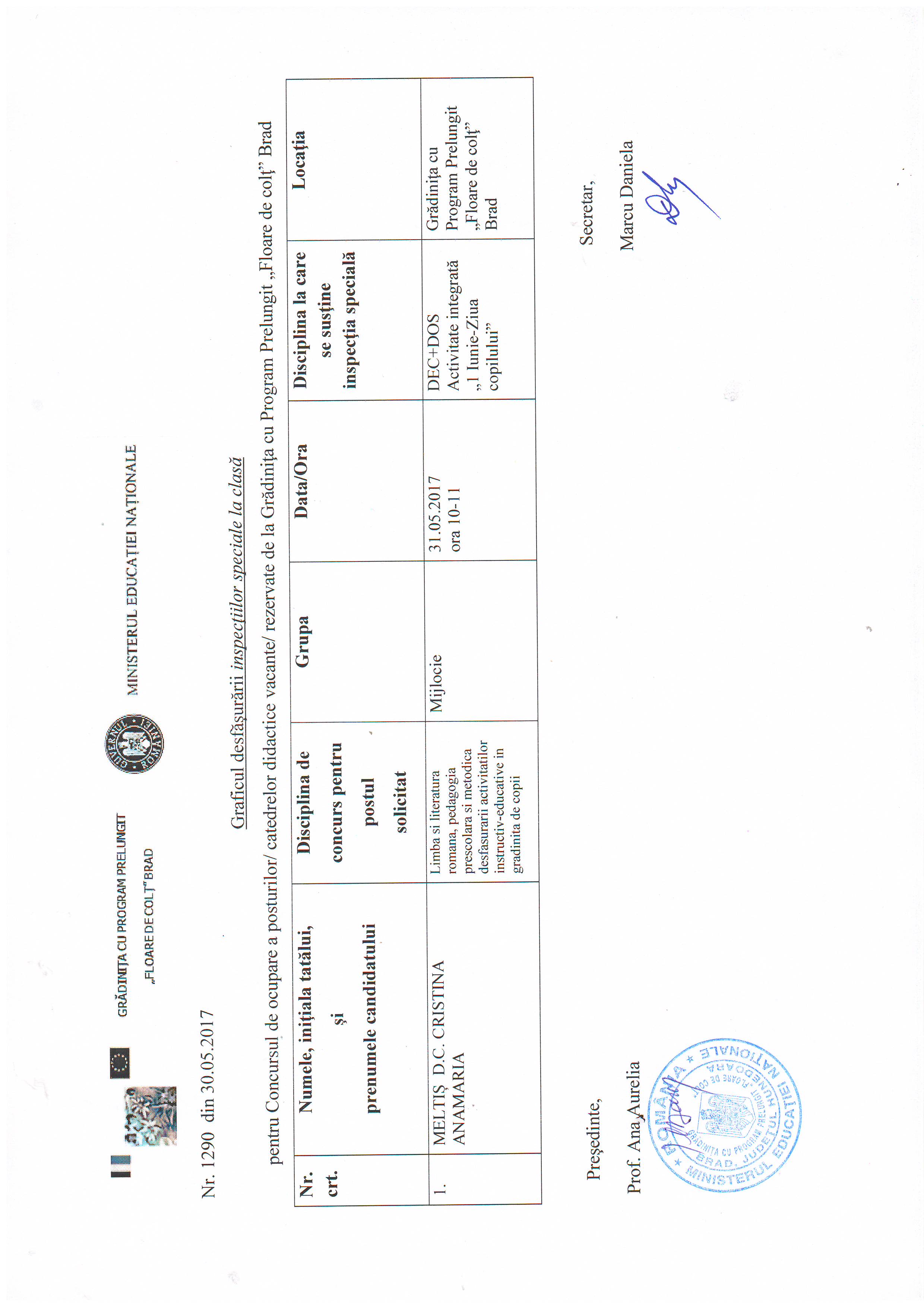 In fisierul atasat aveti graficul privind sustinerea inspectiei speciale la clasa/organizarea probei practice, in cadrul concursului. In vederea stabilirii orei avem rugamintea de a lua legatura cu conducerea unitatii scolare la care ati fost programati.