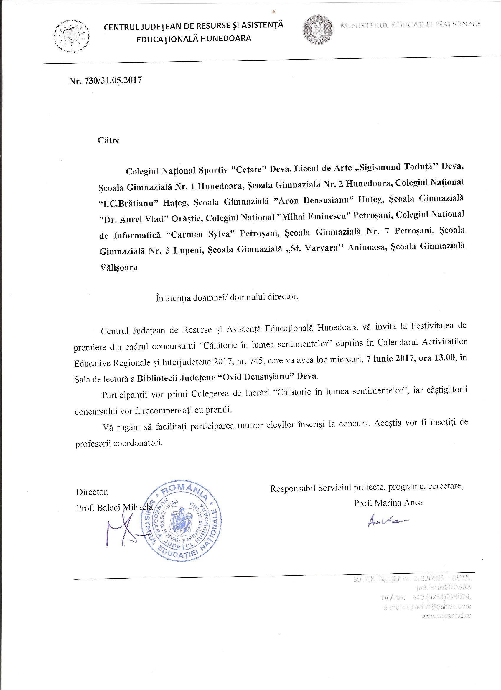 Atașăm adresa de informare a unităților școlare participante din județul Hunedoara.