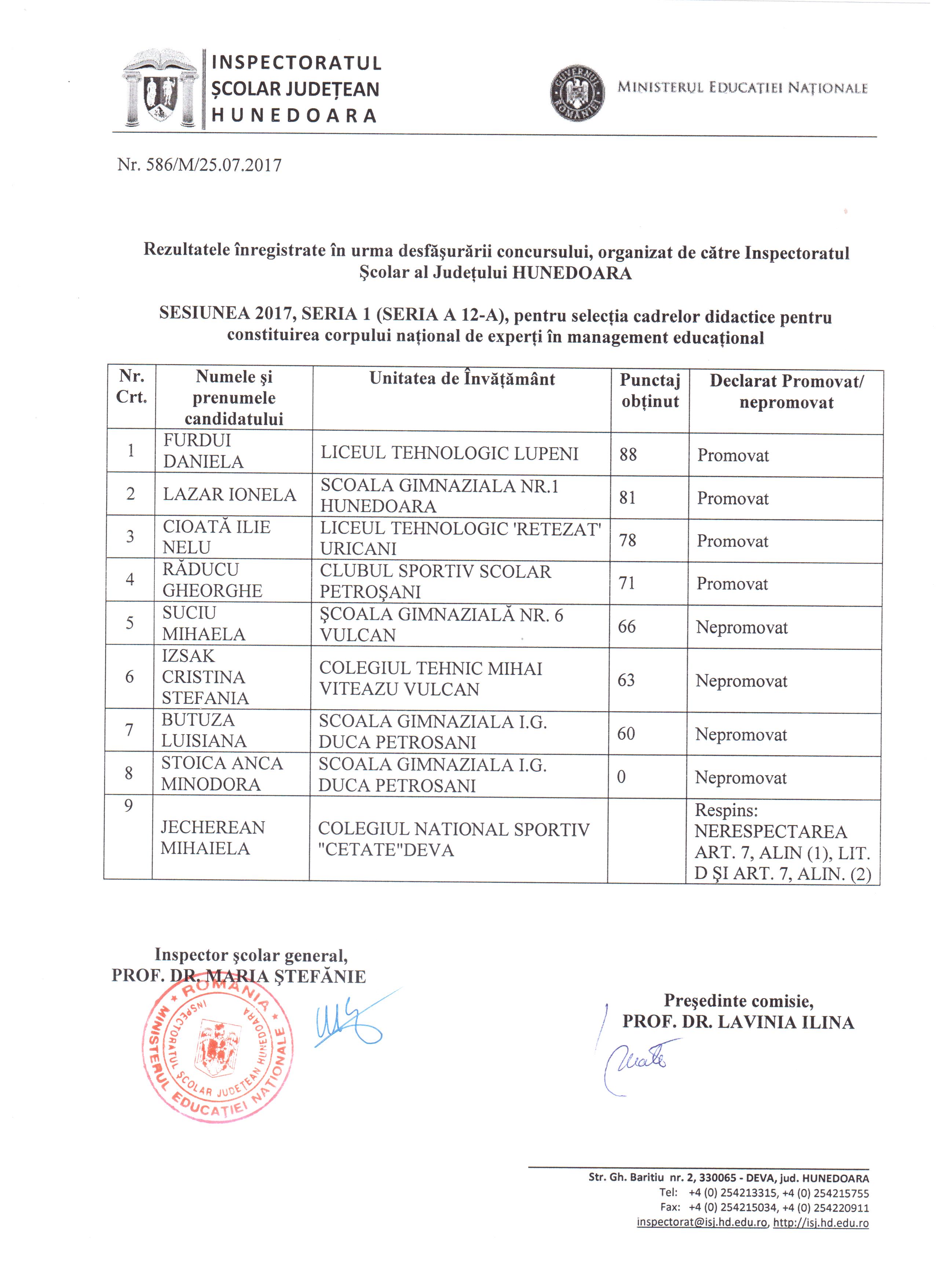 În ataşament, găsiţi rezultatele finale înregistrate în urma desfășurării concursului, organizat de către Inspectoratul Școlar Județean Hunedoara pentru selecția cadrelor didactice pentru constituirea corpului național de experți în management educațional, seria a 12-a, 2017.