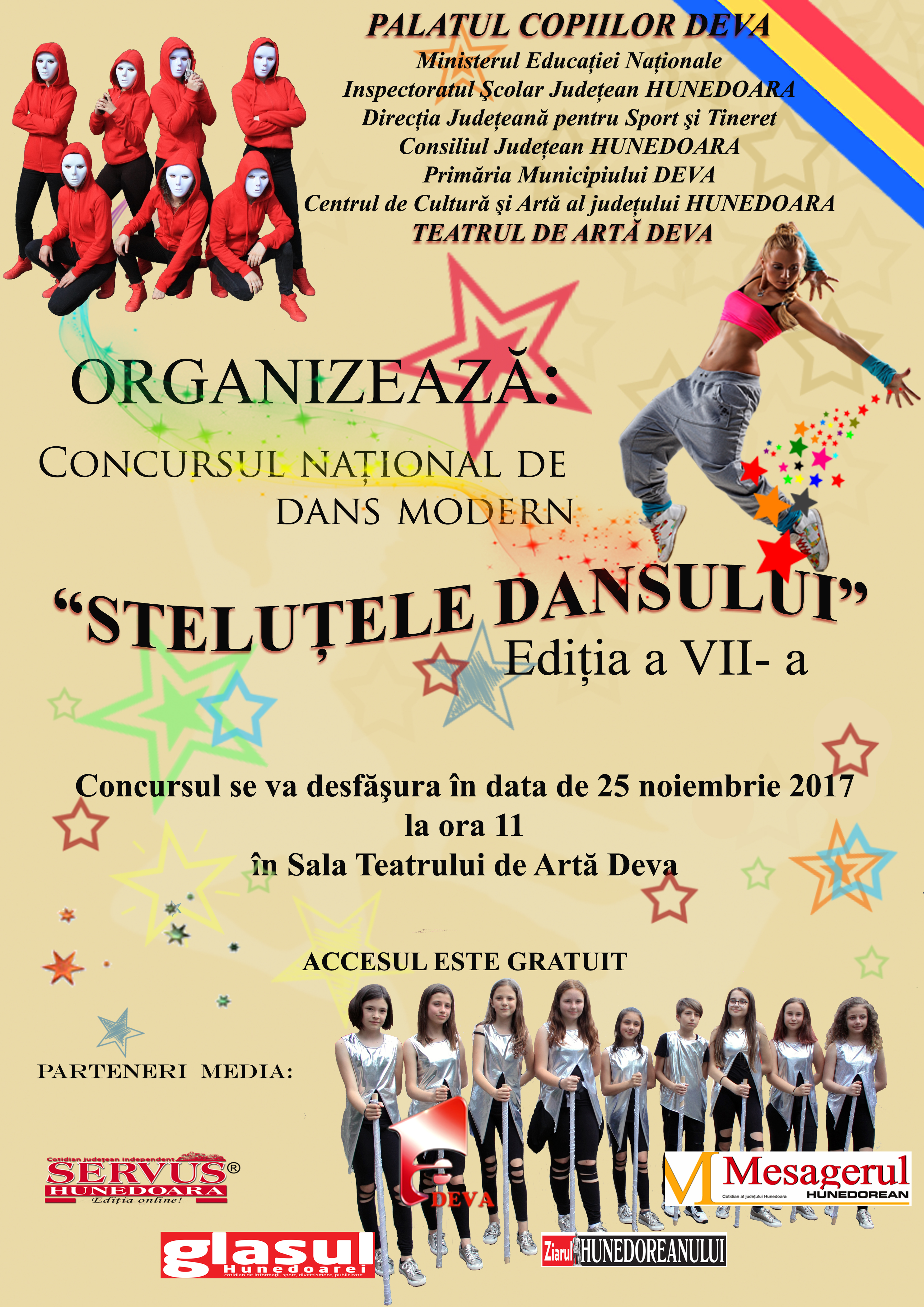 În data de 25 noiembrie 2017, ora 11 , la Teatru de Artă Deva se va derula ce-a de a VII a ediţie a Concursului Naţional de Dans modern " STELUŢELE DANSULUI " .Coordonatorul acestui eveniment este doamna prof. Sorina Cobori - Directorul Palatului Copiilor Deva .