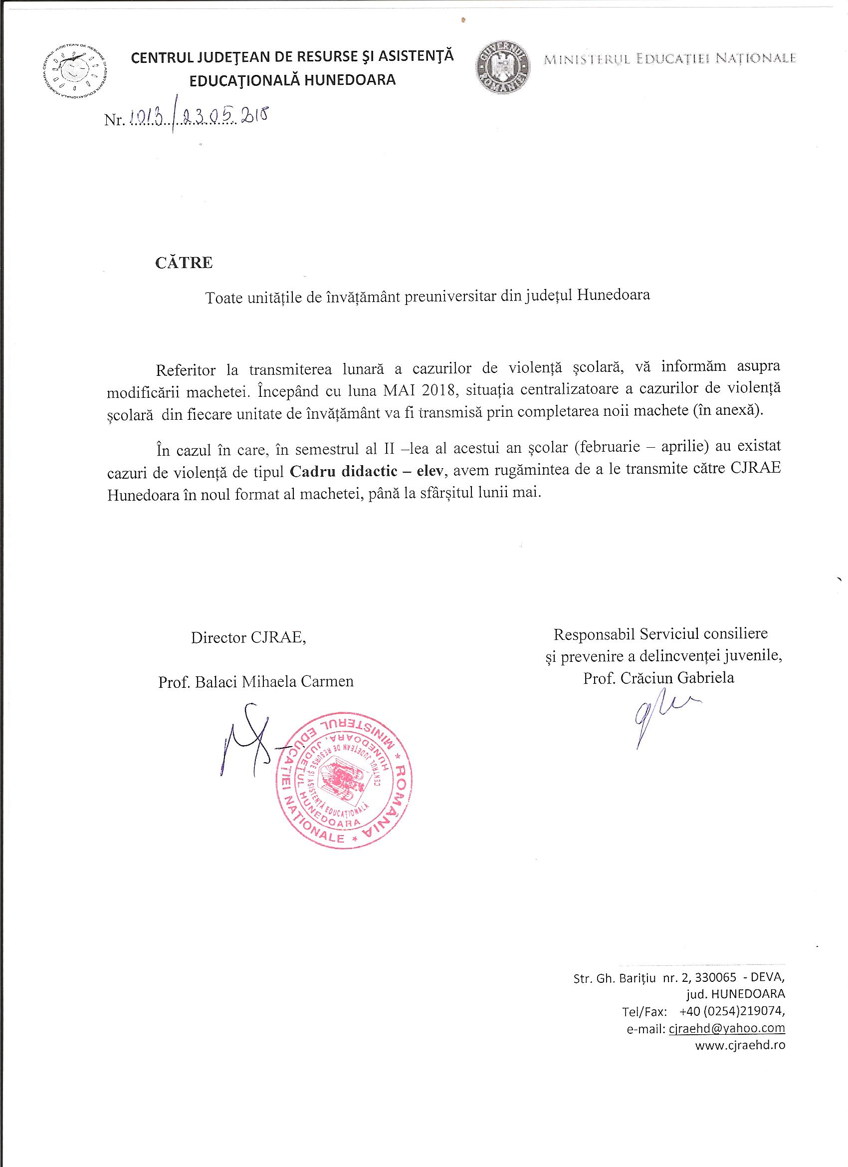 În cazul în care, în semestrul al II –lea al acestui an școlar (februarie – aprilie) au existat cazuri de violență de tipul Cadru didactic – elev, avem rugămintea de a le transmite către CJRAE Hunedoara în noul format al machetei, până la sfârșitul lunii mai.
