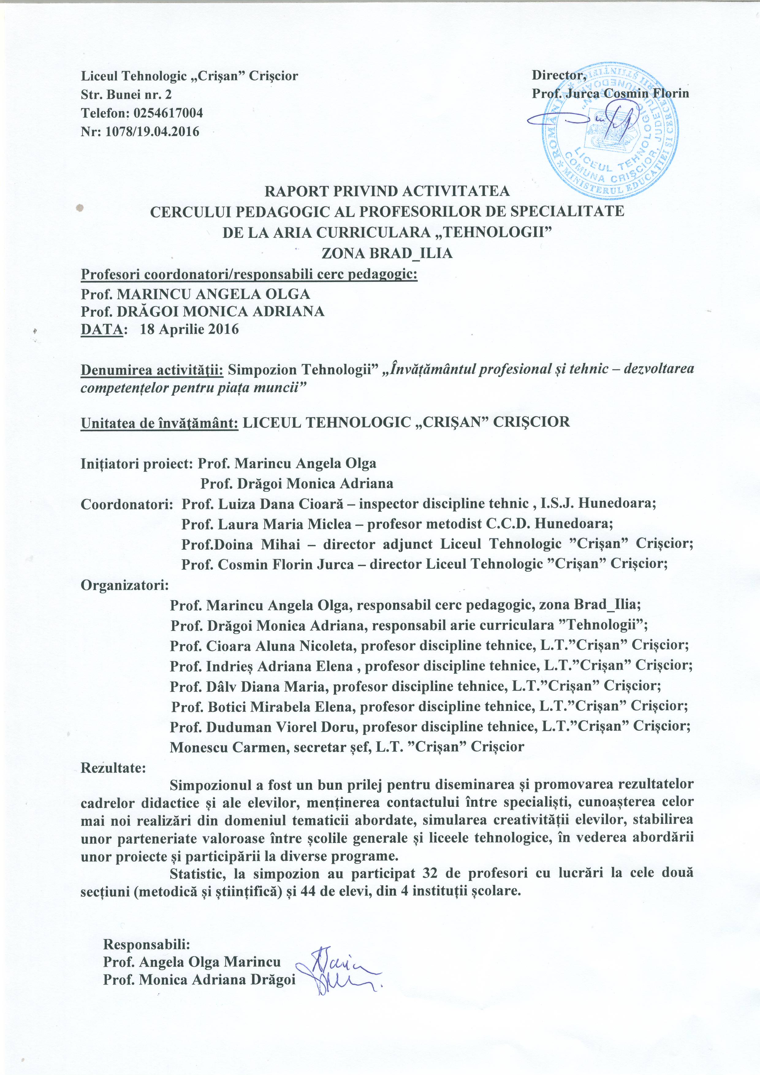 Vă atașăm raportul privind activitatea cercului pedagogic al profesorilor de specialitate de la aria curriculară "Tehnologii" zona Brad-Ilia, din data de 30.03.2016