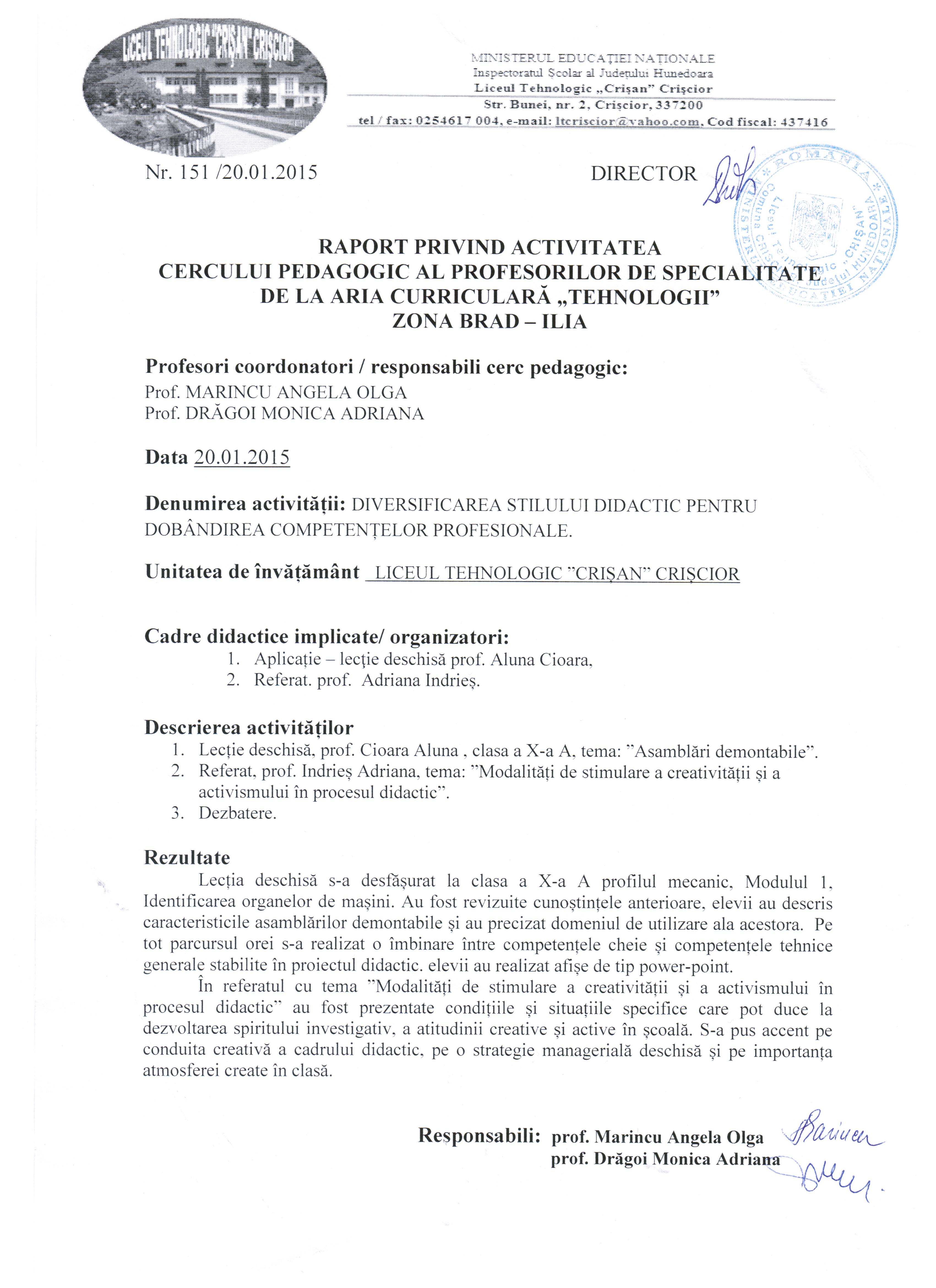 Vă atașăm raportul privind activitatea cercului pedagogic al profesorilor de specialitate de la aria curriculară "Tehnologii" zona Brad-Ilia, din data de 20 ianuarie 2015