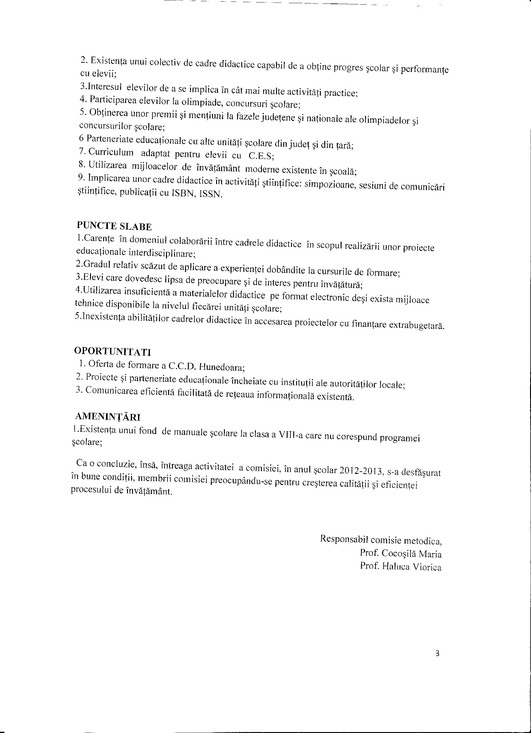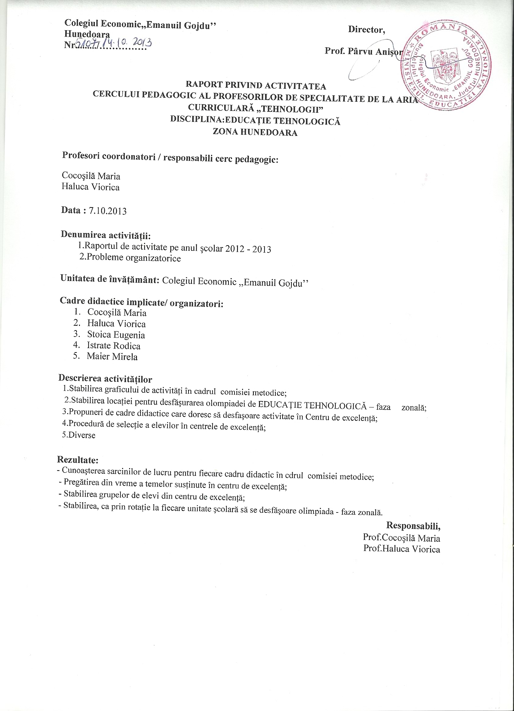 1. Raportul privind activitatea comisiei metodice a profesorilor de educatie tehnologică zona Hunedoara, Călan, Haţeg în luna martie 2013.