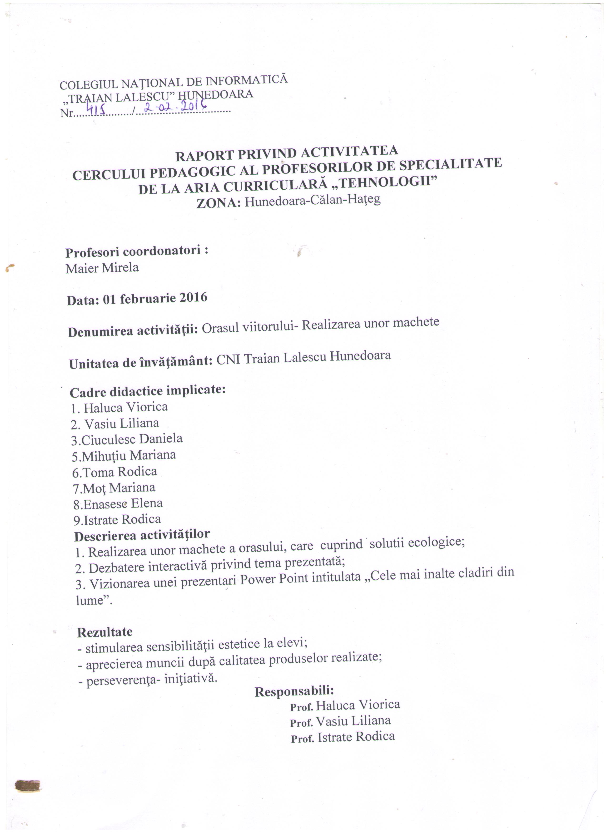 Luni, 1 februarie 2016, ora 14, la C.N.I. "Traian Lalescu" Hunedoara se va desfășura activitatea demonstrativă: ORAȘUL VIITORULUI - coordonator prof. Maier Mirela.