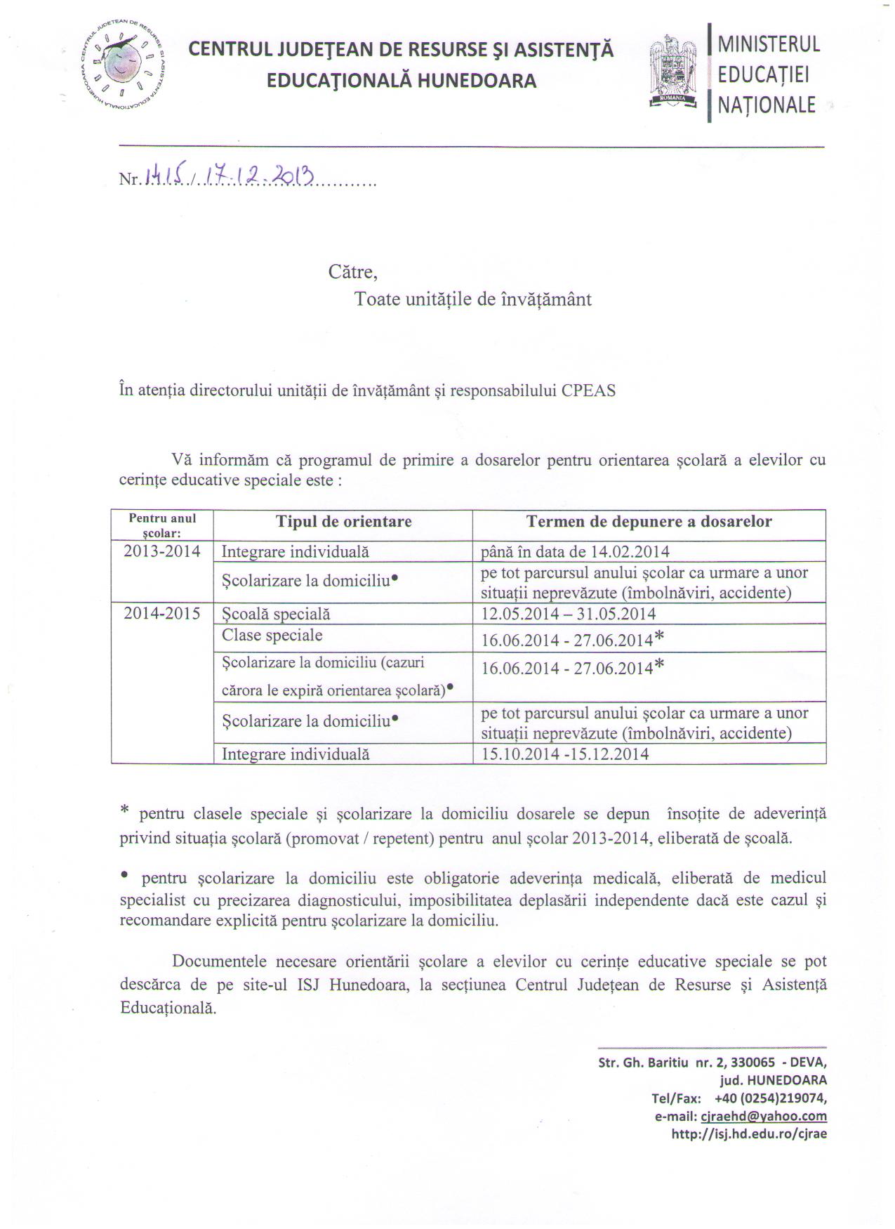 In fisierele atasate veti gasi precizari privind orientarea scolara a elevilor cu CES, calendarul de depunere a dosarelor si modelele actelor necesare.
