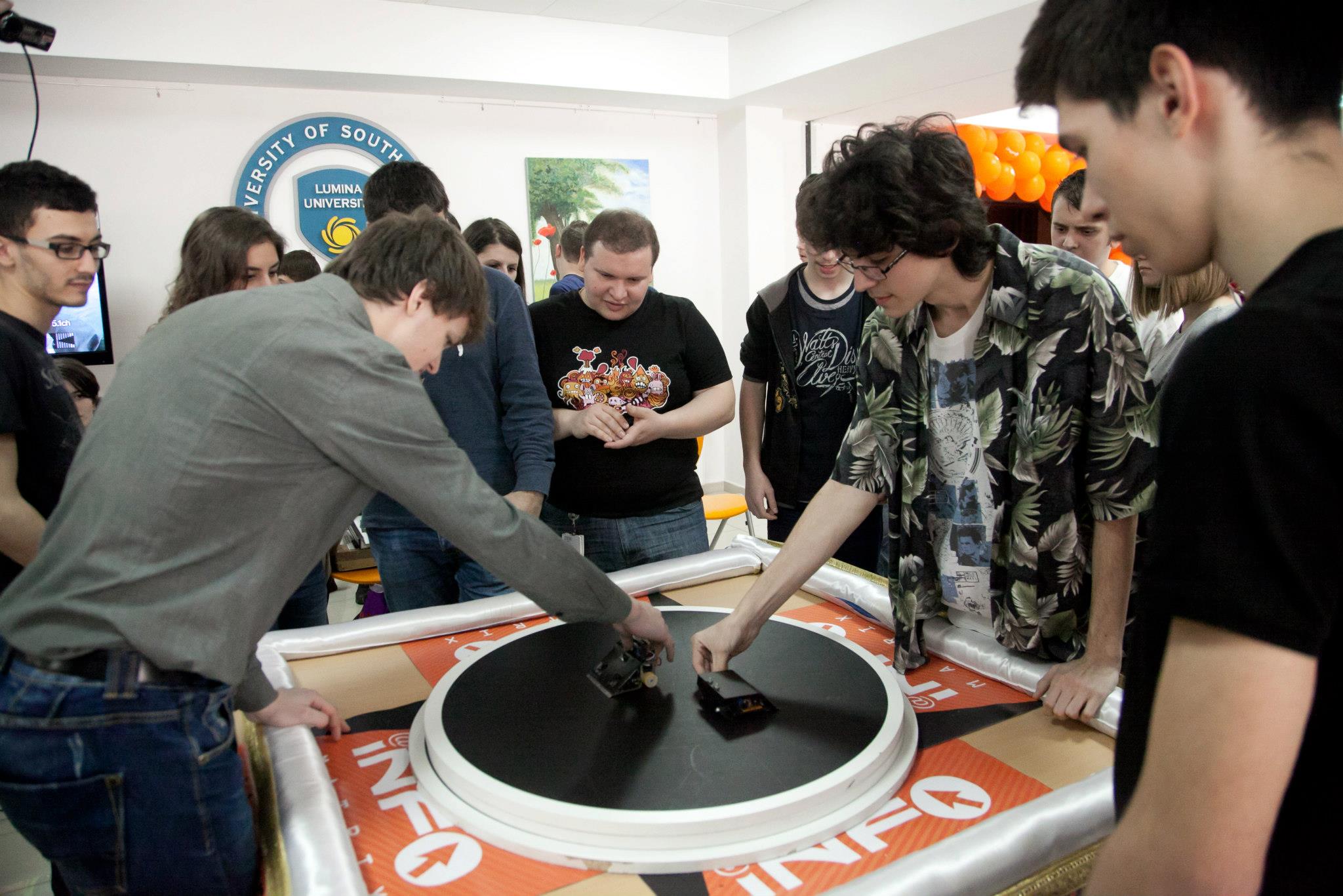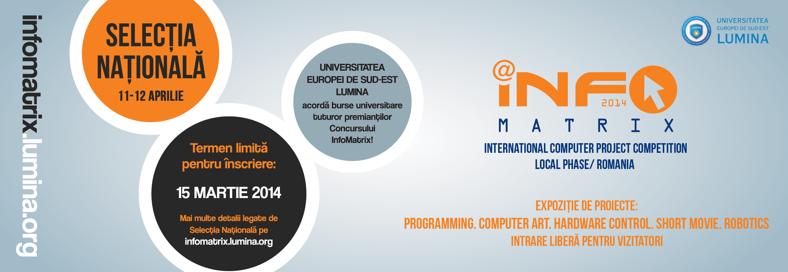 Organizatorii vă invită să îi incurajați pe elevii dumneavoastră să se înscrie la una din categoriile concursului Infomatrix: programare, computer art, hardware control, short movie,sau robotics (line follower, minisumo sau lego sumo). Echipele coordonate de dumneavoastră se pot înscrie la adresahttp://infomatrix.lumina.org/ până la 15 martie 2014. Câștigătorii etapei locale, ce va avea loc în 11-12 aprilie la Universitatea Europei de Sud-Est Lumina vor putea reprezenta România la finala internațională din luna mai.