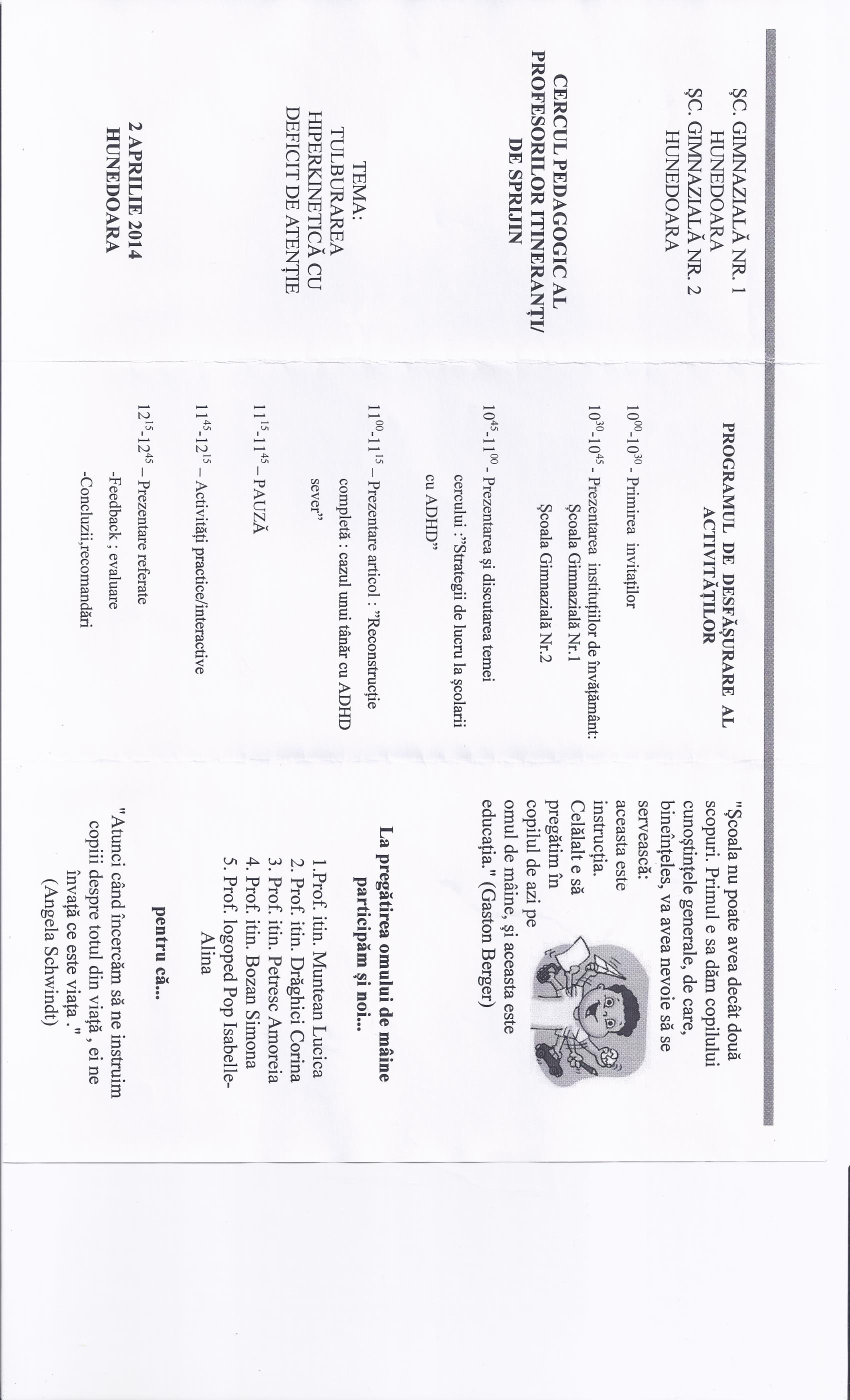 Cercul pedagogic al profesorilor itineranţi/de sprijin va avea loc în data de 2 aprilie 2014, la Scoala Gimnazială Nr. 2 (fosta nr. 11), str. Rândunicii, nr. 6, micro 5, Hunedoara, începând cu ora 10,00.