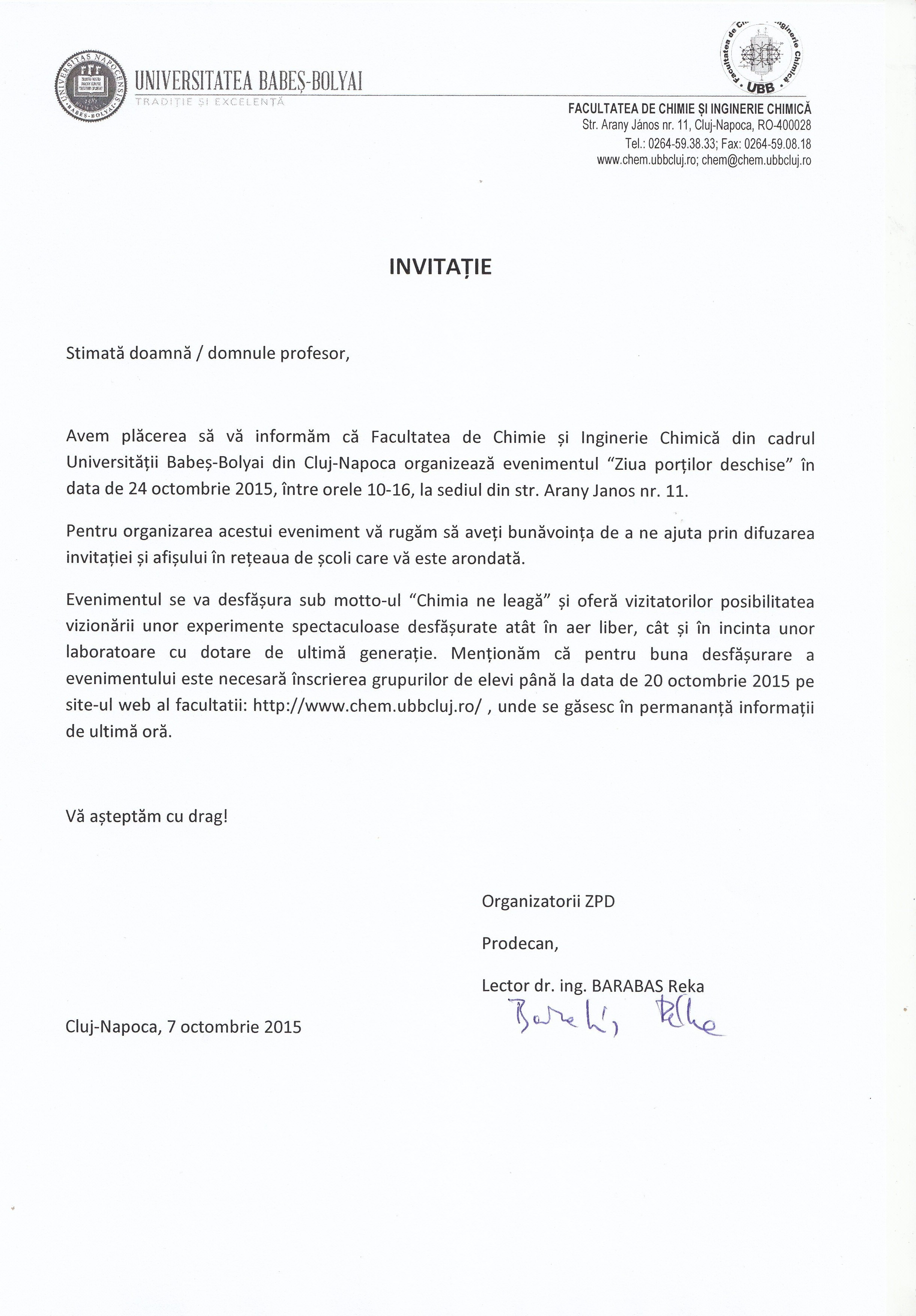 Facultatea de Chimie si Inginerie Chimica din cadrul Universitatii "Babes-Bolyai" Cluj-Napoca organizeaza in data de 24 octombrie 2015, intre orele 10-16, la sediul facultatii din str. Arany Janos nr. 11, evenimentul "Ziua portilor deschise" .