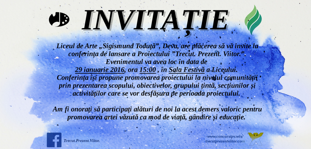 Vă invităm la Conferința de lansare a proiectului care va avea loc în data de 29 ianuarie 2016, la ora 15.00, în Sala Festivă a Liceului de Arte „Sigismund Toduță”, locația Ciprian Porumbescu, din Deva.